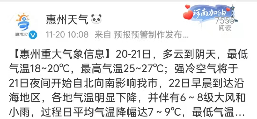 强冷空气将于今天夜间开始自北向南影响我市,22日早晨到达沿海地区,各地气温明显下降,并伴有6~8级大风和小雨,最低气温下降到11~13℃;