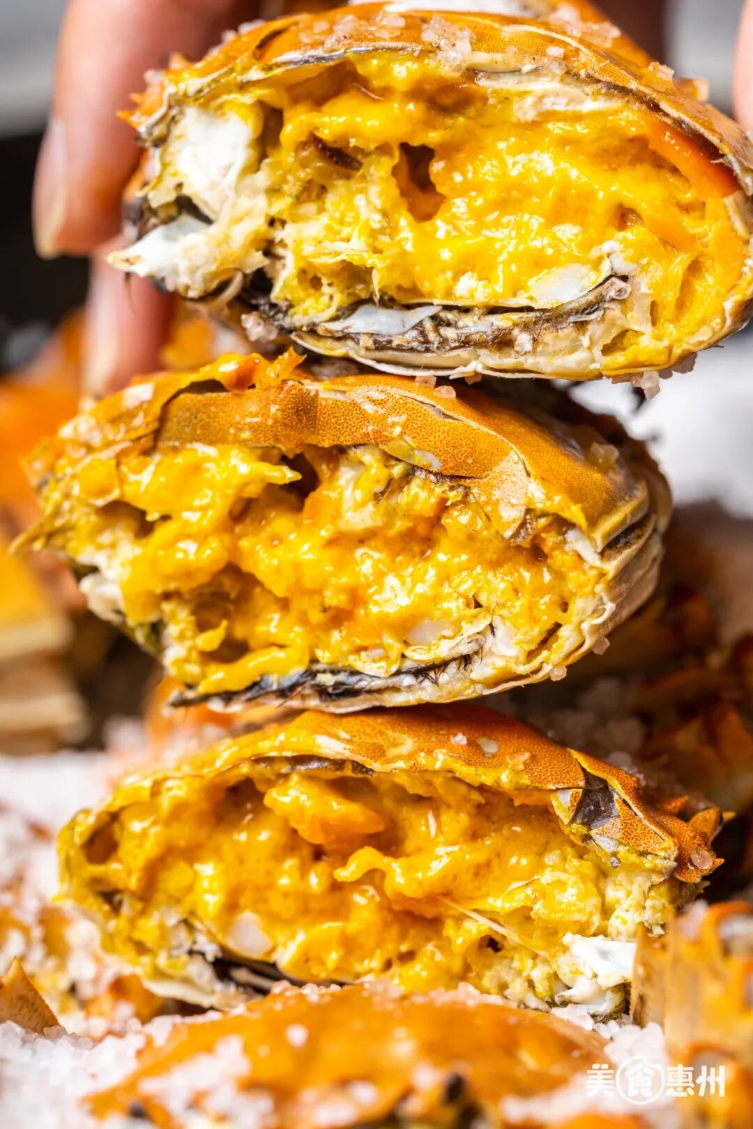 这个季节的盐焗蟹,打开就是令人垂涎的“九月黄”!用粗盐焗熟再上锅蒸,简单的烹饪做法,就能把蟹的原汁原味全部牢牢锁住,肉质也是十分丰富饱满。