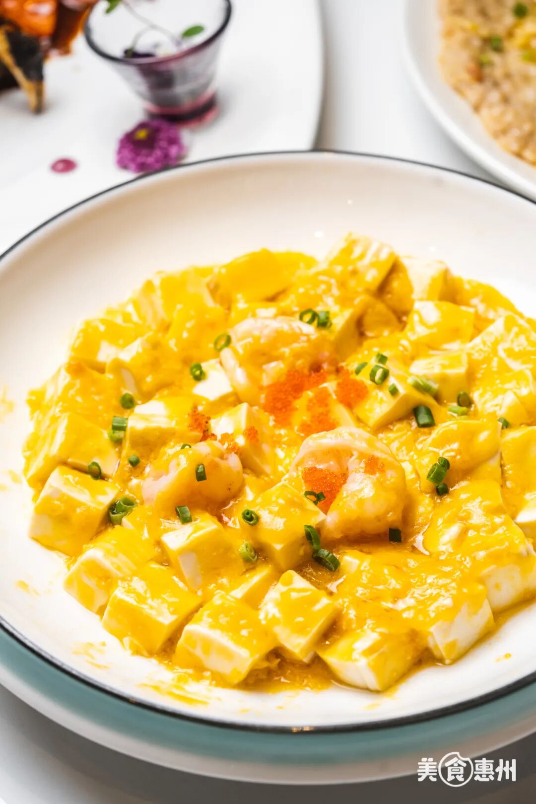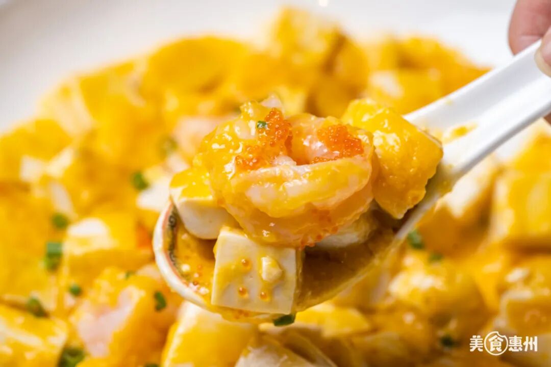 雪白软嫩的豆腐、鲜嫩弹牙的虾仁,被金灿灿的蟹粉笼罩,既保留了大闸蟹独有的鲜美,还夹带着沙沙的香气,光是看着就让人垂涎欲滴,一定要用来拌上几碗米饭才过瘾!