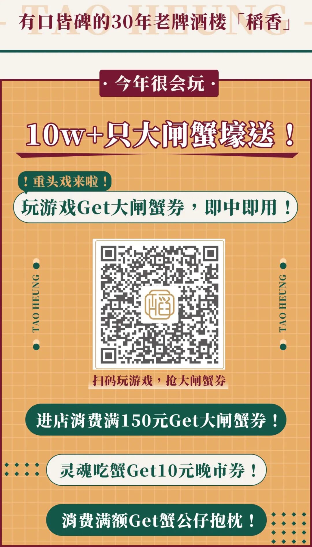 参与“我要吃大闸蟹”闯关游戏,闯关成功即可参与抽奖,随机获得大闸蟹券/10元晚市代金券,百分百中奖!偷偷告诉你们,蟹券中奖率极高,即中即用!玩游戏白嫖大闸蟹,还不召唤身边小伙伴一起冲?