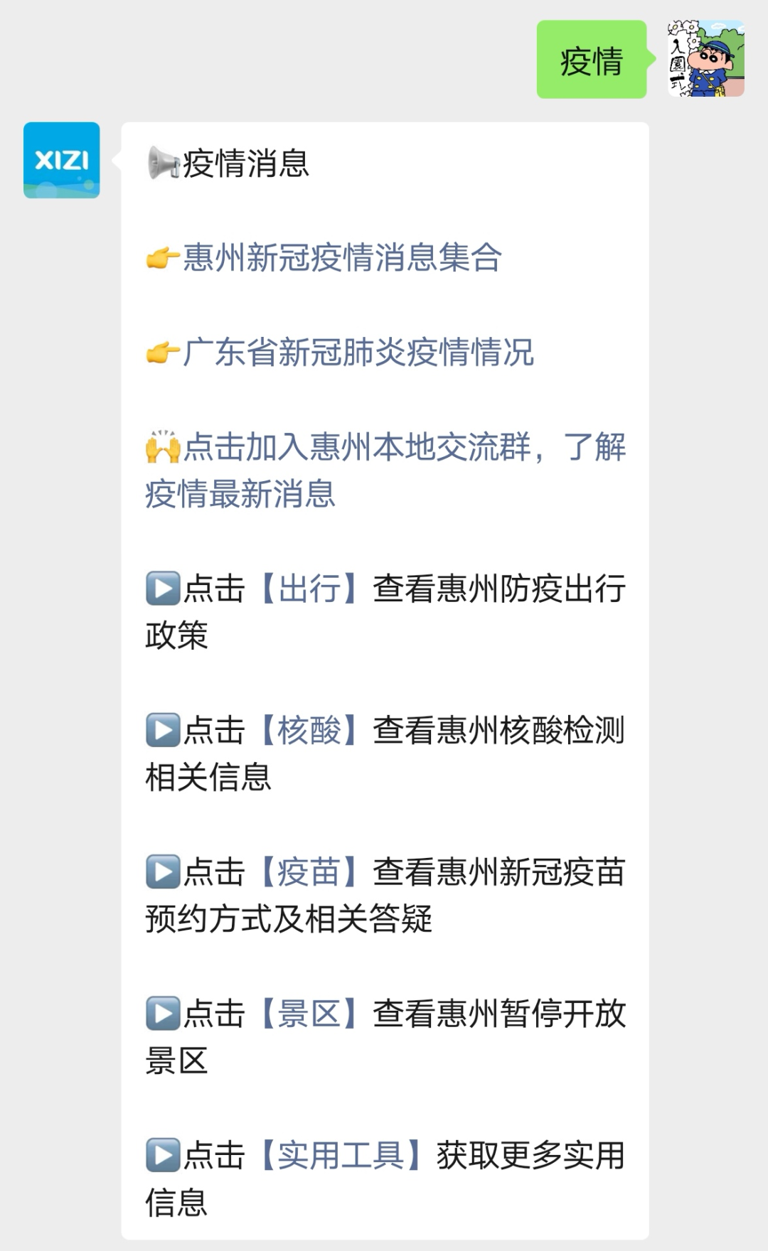2、在西子湖畔公众号后台对话框回复“疫情”,即可查看惠州最新疫情消息、来惠返惠核酸检测、隔离要求。