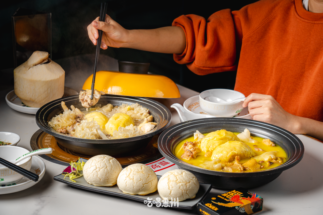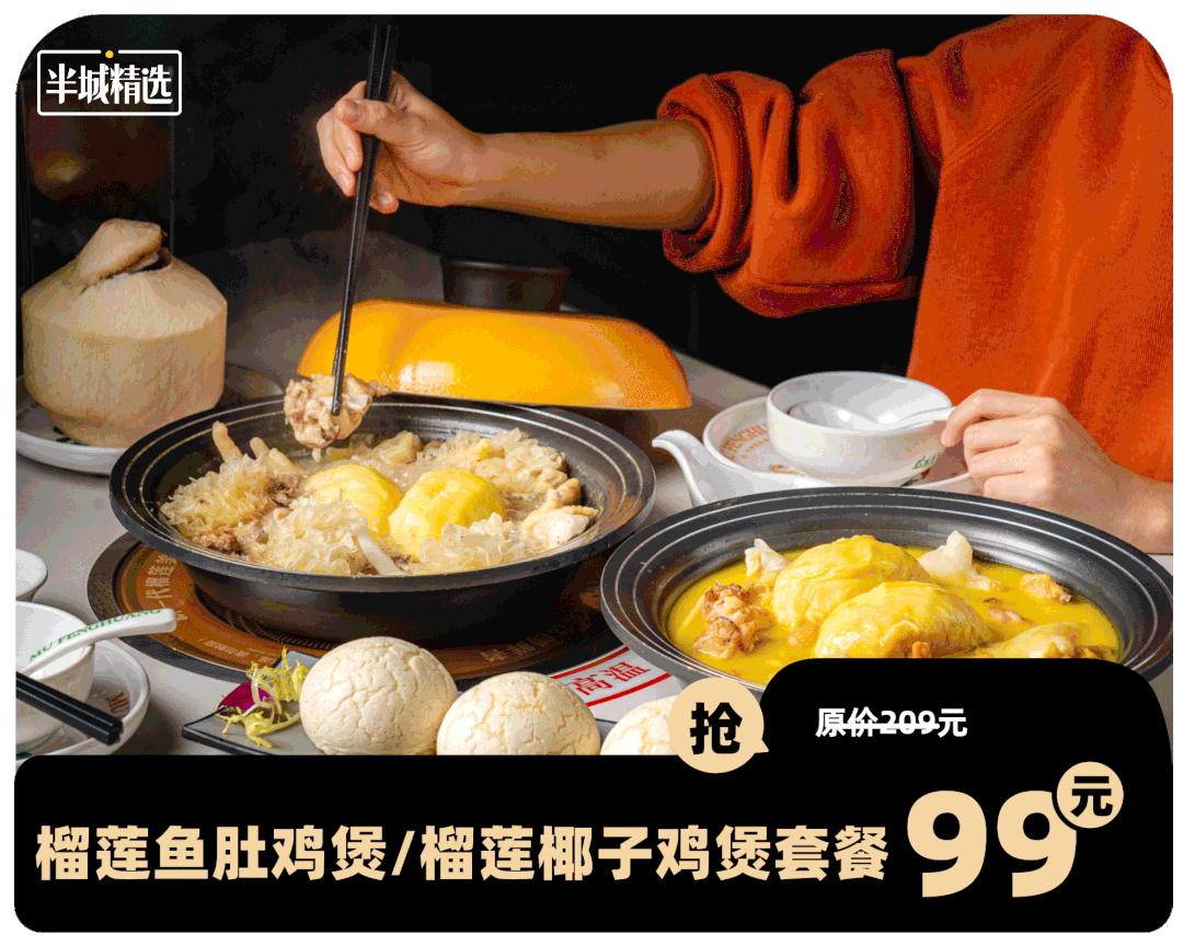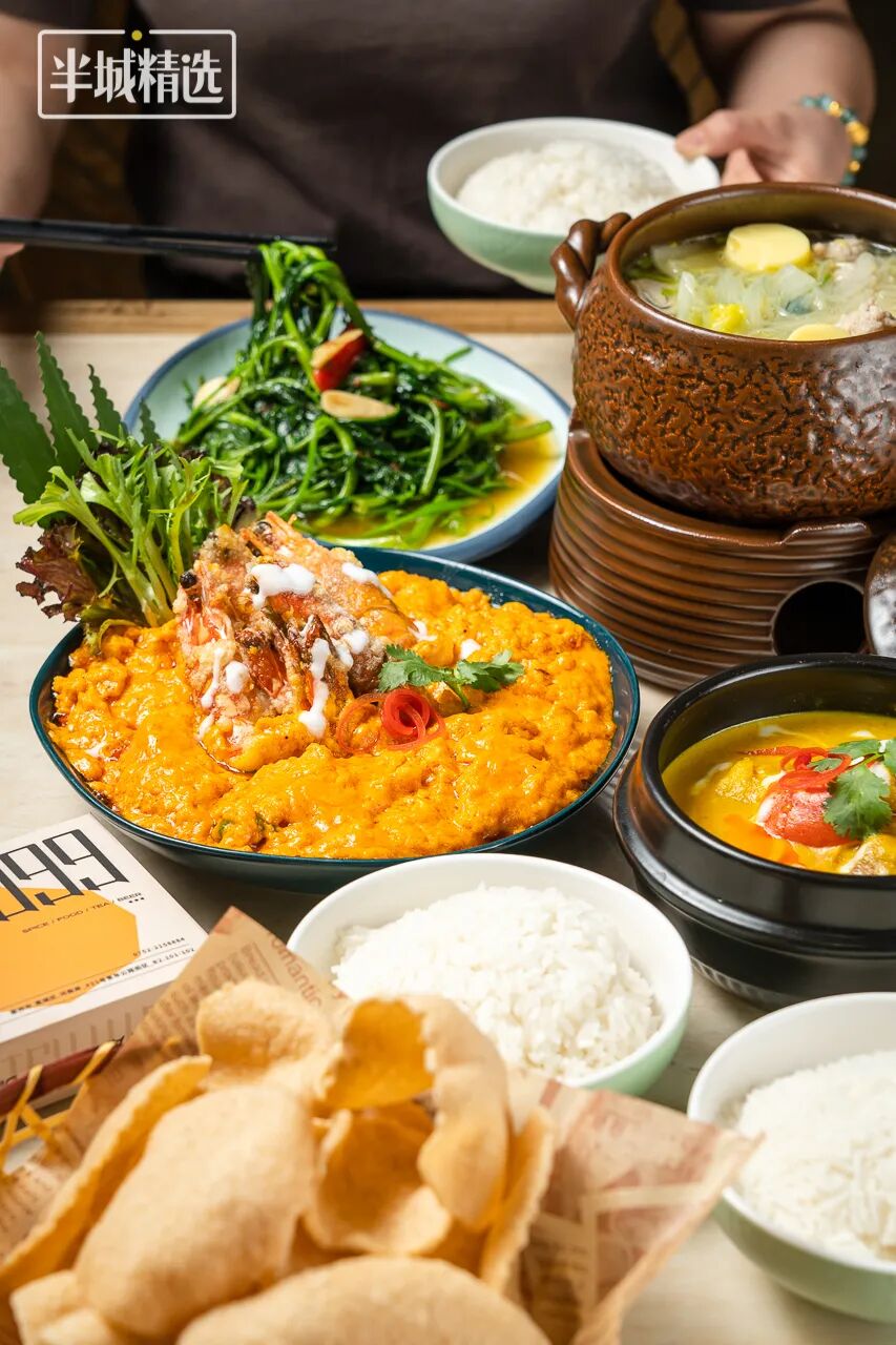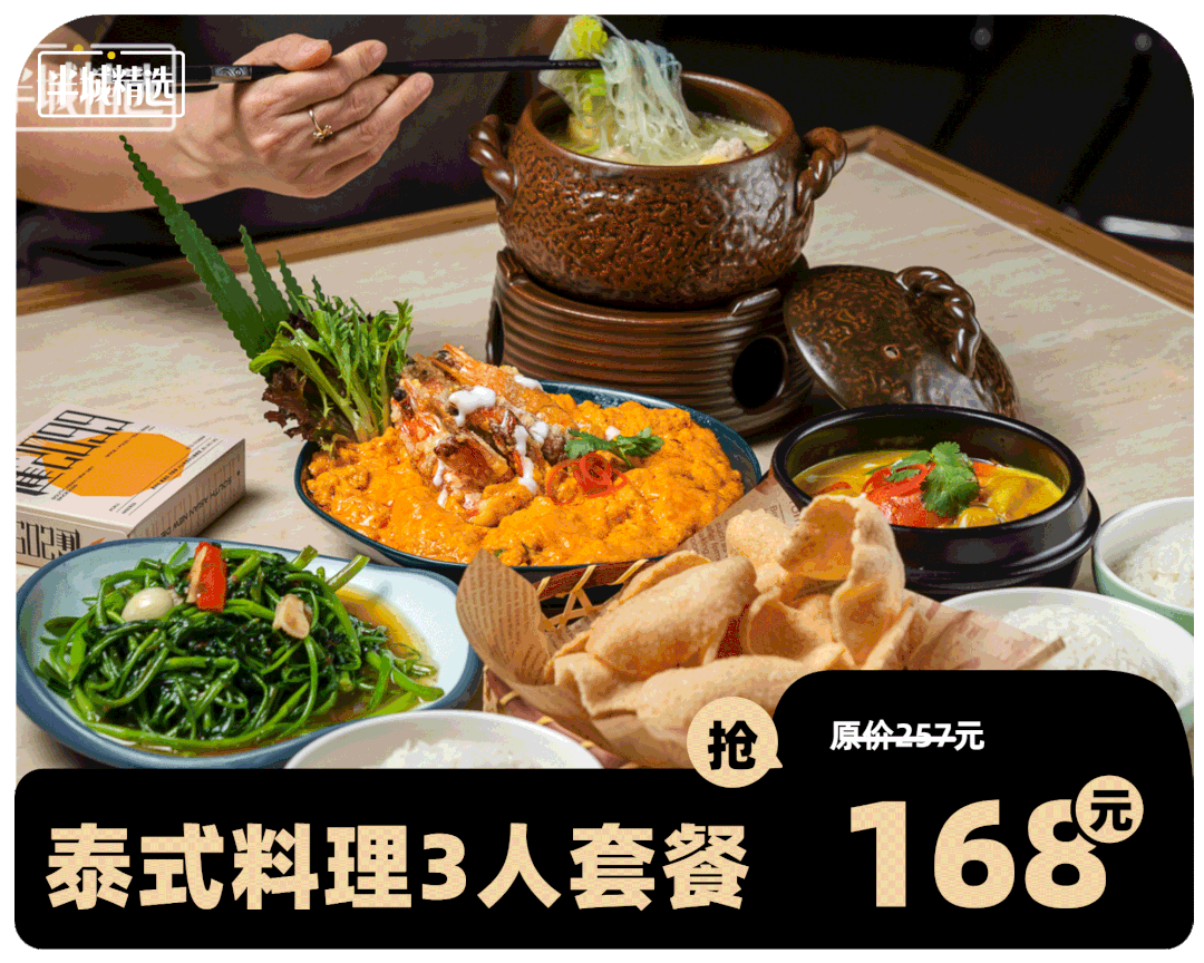 168元抢3人特色套餐:泰皇咖喱九节虾+黄咖喱鸡肉虾+南洋粉丝豆腐汤+虾酱通菜+泰式虾片+曼泰吉泰国香米*3+茶位*3+纸巾*1,人均50+元尝特色南洋风味菜!