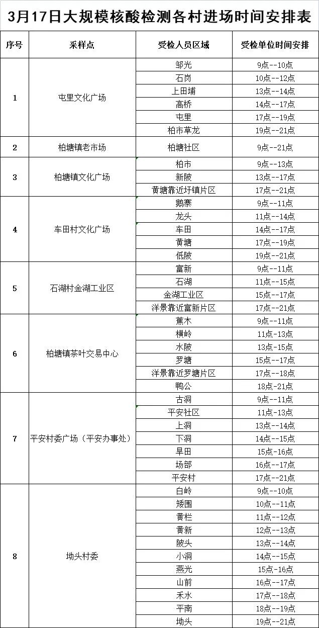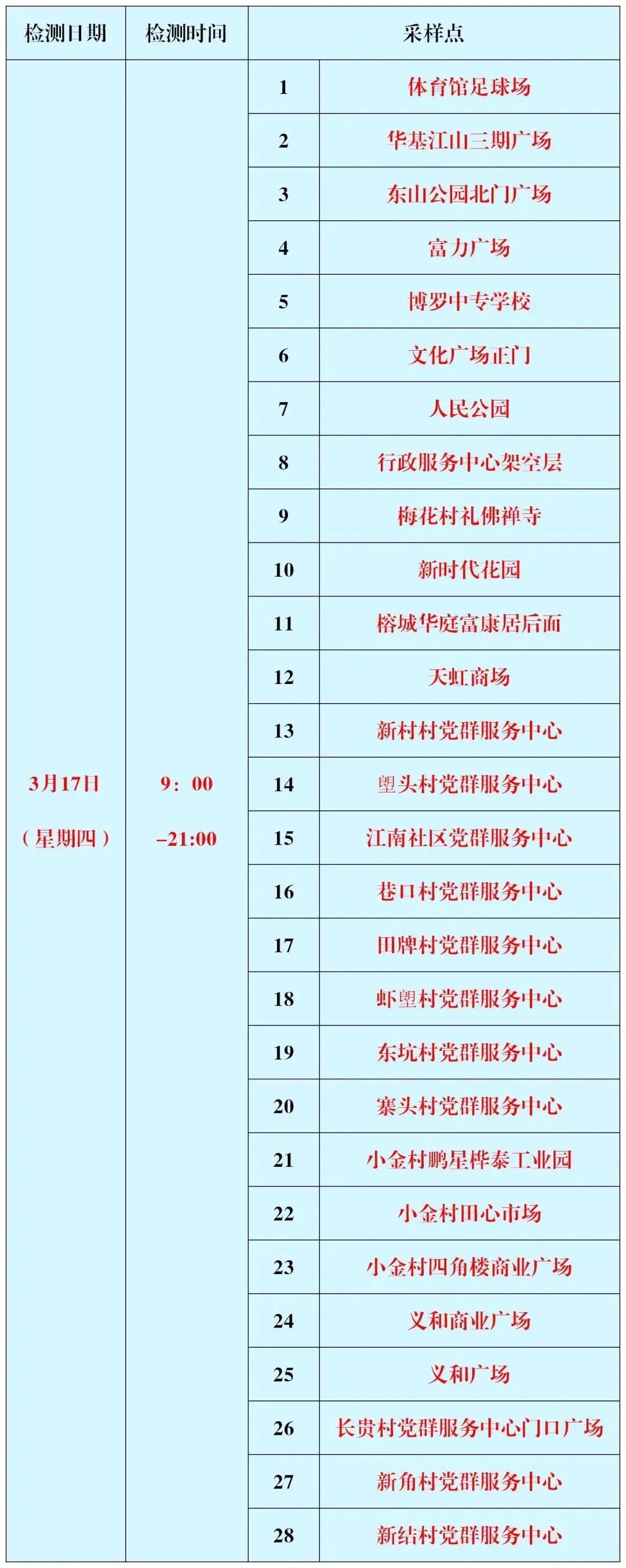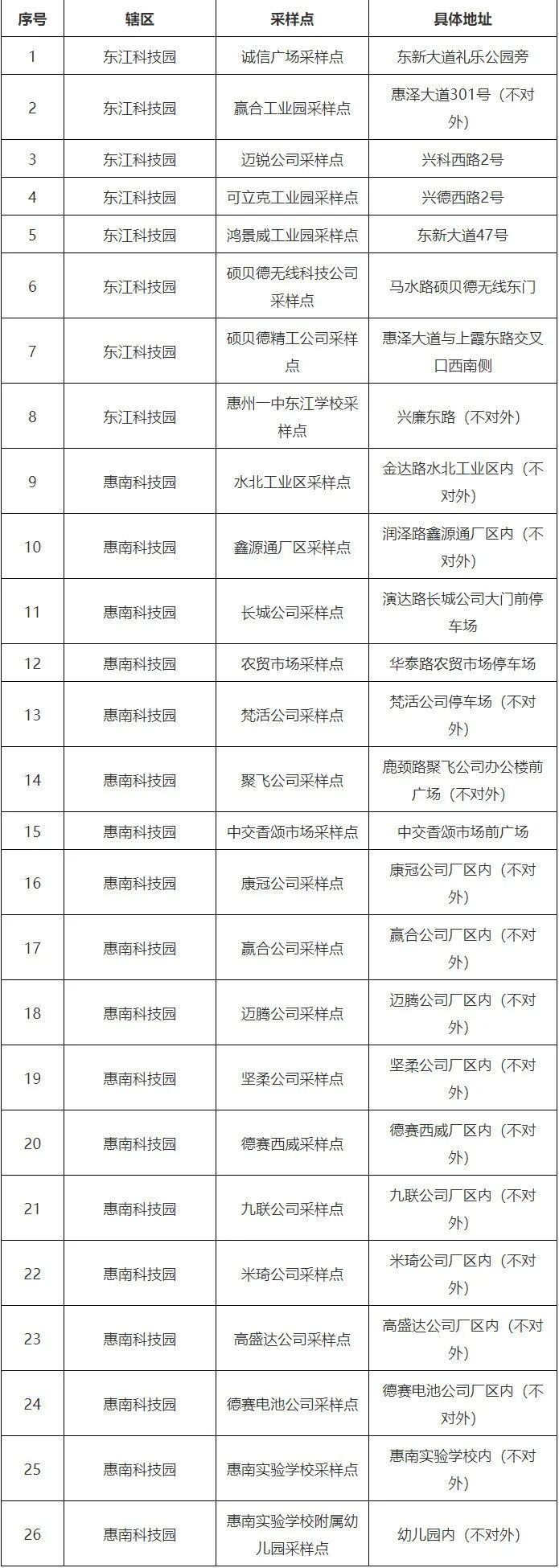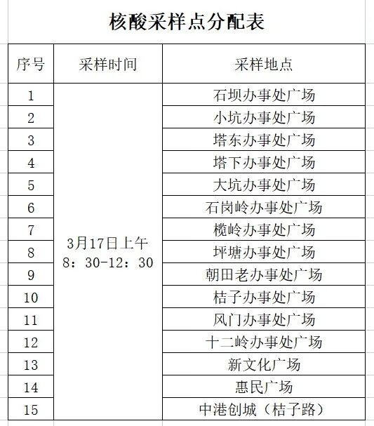 近日,惠城区新型冠状病毒肺炎疫情防控领导小组办公室发出《关于开展社会面大规模核酸检测的通告》,明确在全区社会面开展大规模核酸检测。其中2022年3月17至18日,主要面向市民朋友开展核酸检测,附3月17日全区各镇街核酸采样点位置表。各地具体核酸检测点和时间安排,以当地镇街实际安排为准。