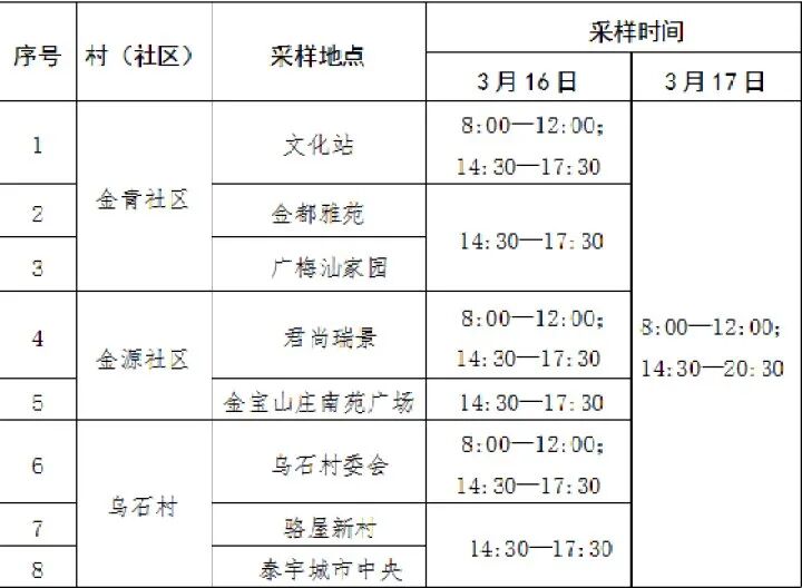 在辖区10个村(社区)共设置21个采样点(地点和采样时间详见下表),请广大群众自行有序前往采样点采样。