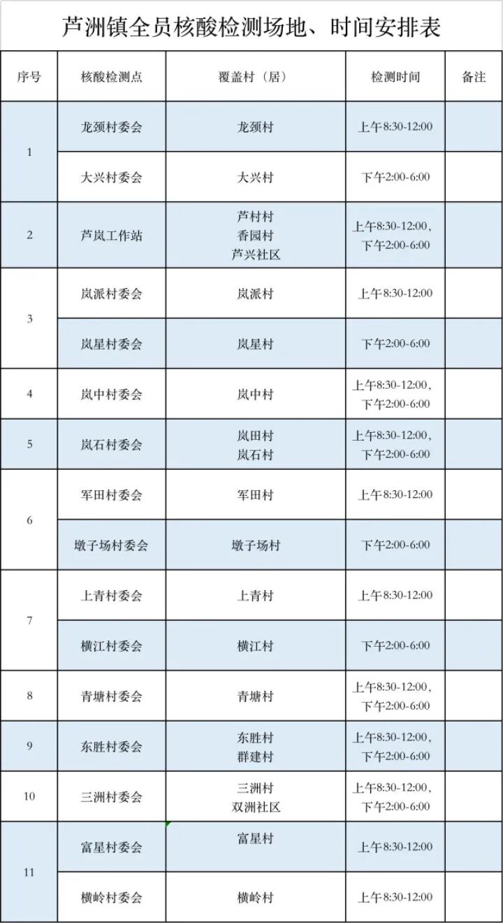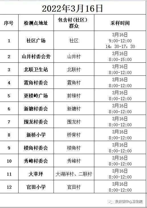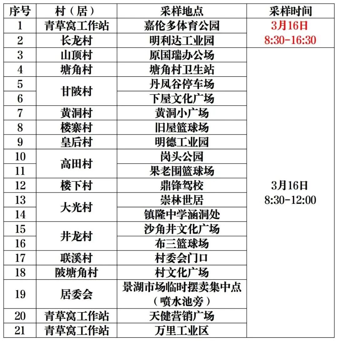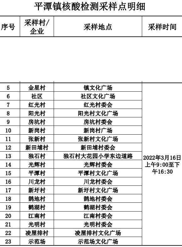 平潭镇将于16日在辖区内开展大规模核酸检测工作,采样地点、时间如下图表。请广大居民根据各自村(社区)、示范场或企业安排的时间段,自行前往。