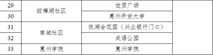 社区广场、东升丝花厂广场(良井镇政府对面)、山井村委会旁、北联卫生站、霞角村委会、前锋村更楼岭广场、新塘村委会、围龙村委会、桥背新桥小学、楼角村委会、矮光碧桂园停车场、秀峰村委会、大湖洋村(二联村)大草坪、时化村委会、官田小学、松元村委会、大白村吉文公祠堂。