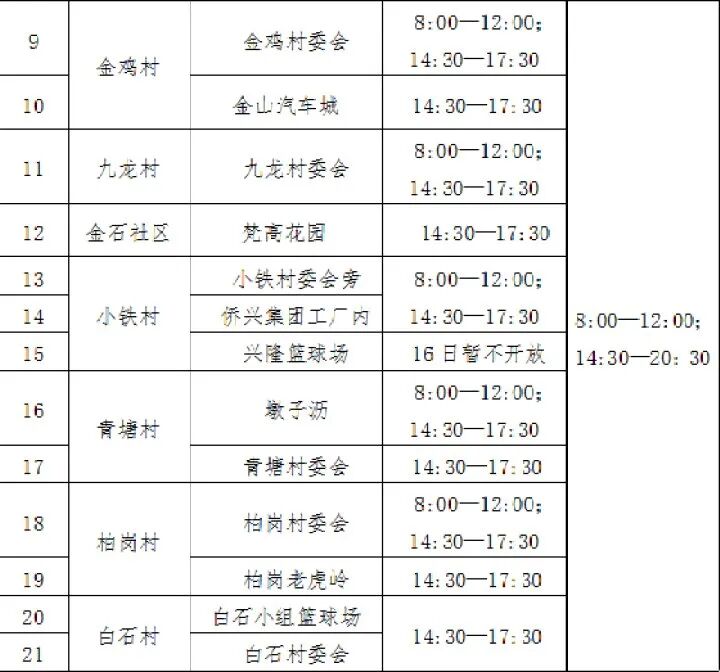 这次核酸检测共设置21个对外采样点,启用地点、时间如下图表。请广大居民根据各自村委或社区安排的时间段,自行前往。