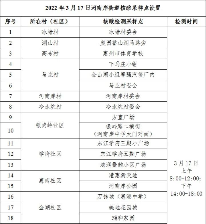 河南岸街道3月16日设置12个核酸采样点,3月17日设置33个核酸采样点。具体详见下表: