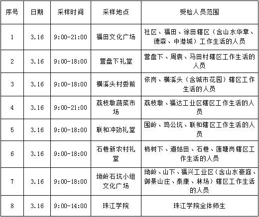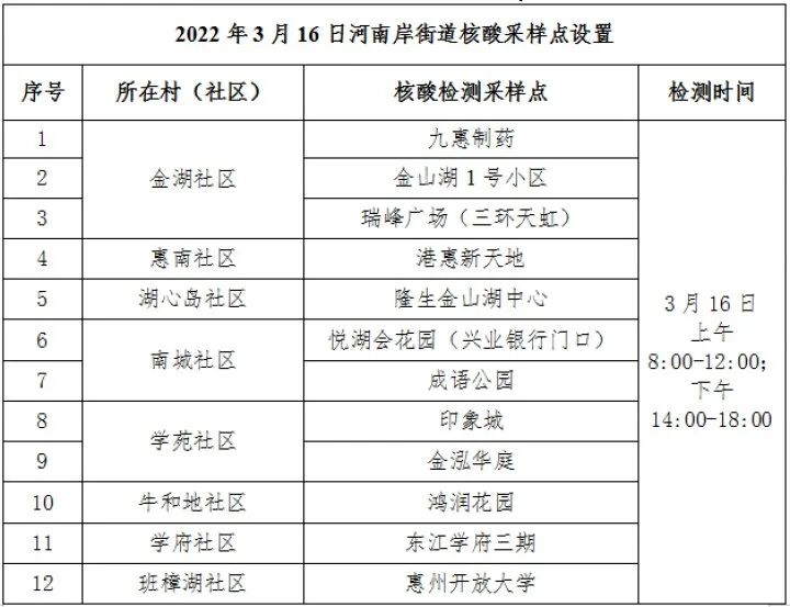惠阳区沙田镇将于3月16日(星期三)9:00-18:00(中午不间断),开展全员核酸检测工作,共设置3个对外采样点,具体地点及涉及范围如下: