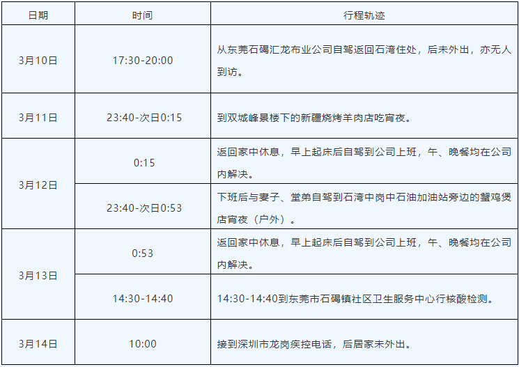 现公布一名深圳通报的新冠肺炎病例的密切接触者在博罗县石湾镇的活动轨迹排查情况,如在以下时间段有到过相关区域活动的人员,请按相应要求自觉落实防控措施并尽快开展1次核酸检测。