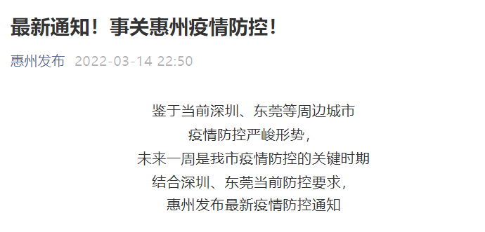 从3月11日开始到3月20日,深圳、东莞全域来(返)惠人员采取7天居家隔离+7天居家健康监测措施,第1、4、7、14天各检测一次核酸