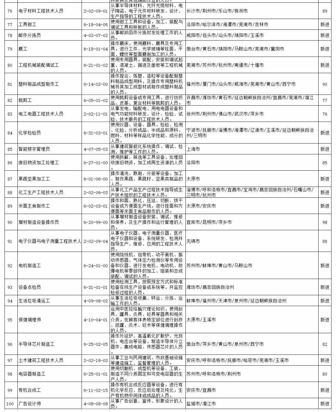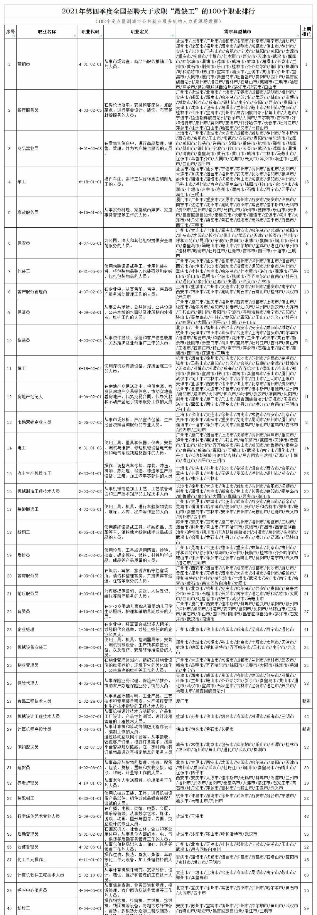 人力资源和社会保障部发布2021年四季度“最缺工”的100个职业排行,其中,营销员、餐厅服务员、商品营业员、车工、家政服务员、保安员、包装工、客户服务管理员、保洁员、快递员等职业位列排行前十。