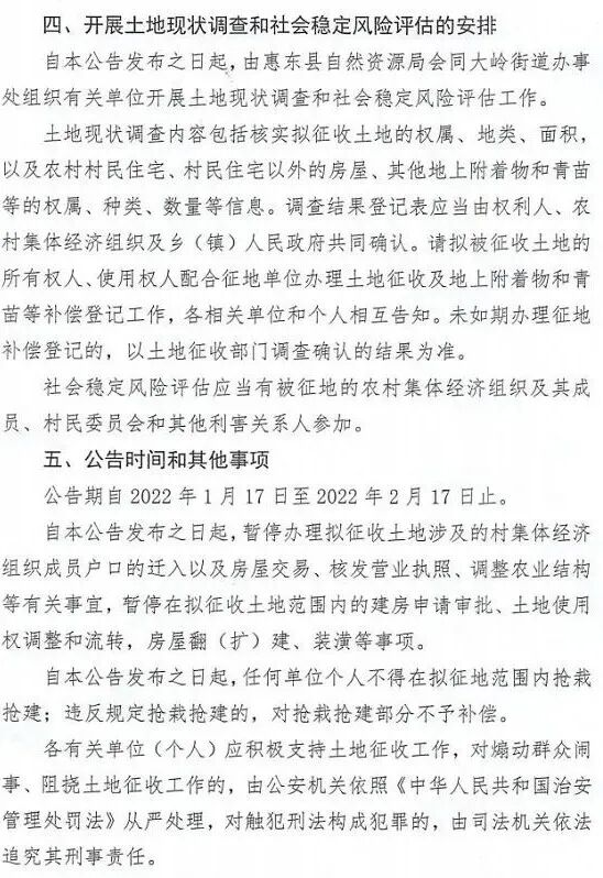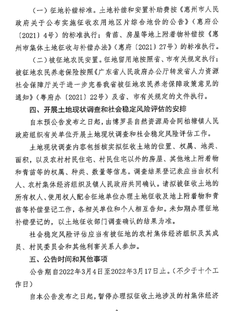 四、上述土地范围内的土地权属单位及青苗等地上附着物权利人,应在本预公告发布之日起15天内到潼湖镇政府办理土地征收补偿登记手续。逾期不办理征地补偿登记的,其补偿以潼湖镇政府调查结果为准。(公告发布于3月11日)