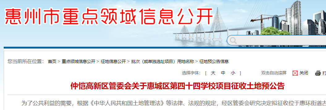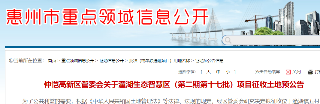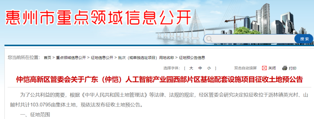 拟征收土地用于广东(仲恺)人工智能产业园西部片区基础配套设施项目建设。