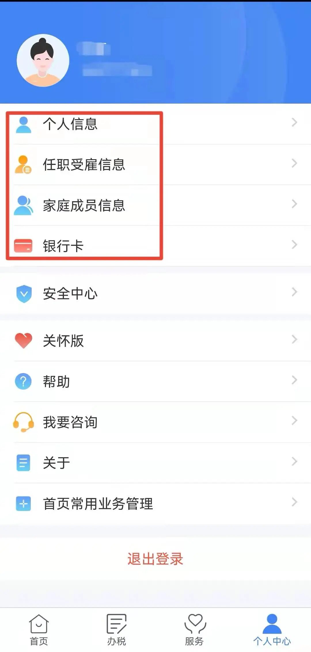 注册并登录后,在【个人中心】模块下【个人信息】、【任职受雇信息】、【家庭成员信息】可分别查看和修改相应的基础信息。为方便办理补税或者退税,在【个人中心】模块下的【银行卡】,点击下方“添加”,按照步骤完成银行卡添加。已经填好的可以略过这一步。