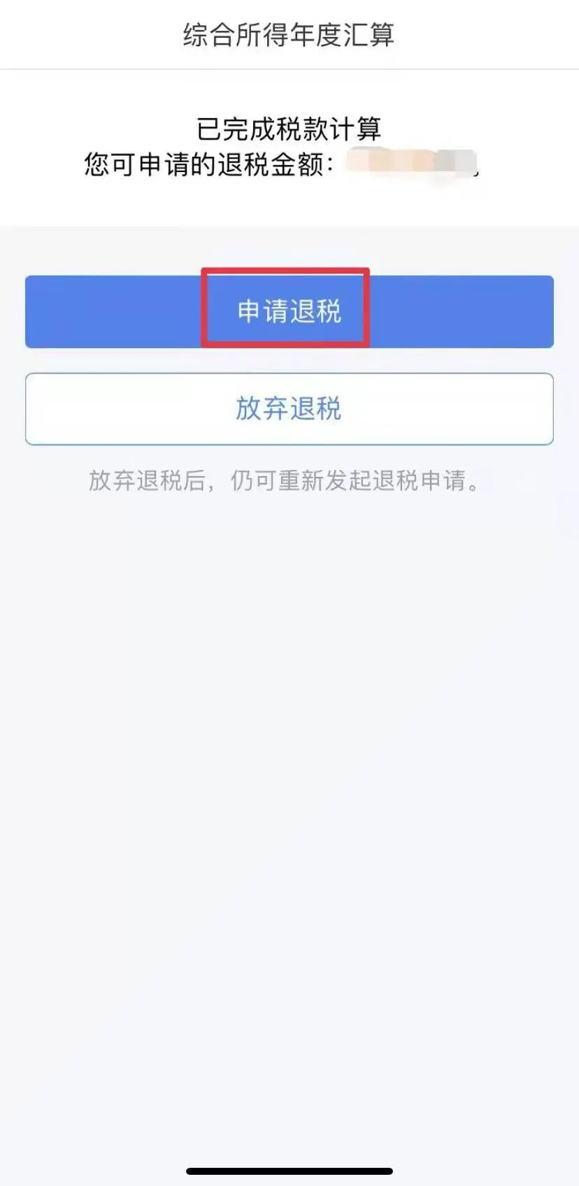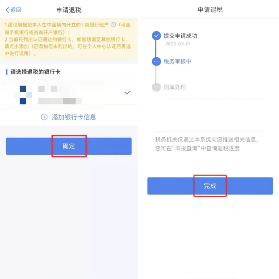 之后页面会显示你需要退税或补税。如果你是要退税,点击【申请退税】,选择退税银行卡进行确认即可。如前期已添加过银行卡,系统将自动带出已填银行卡信息;如您需新增,点击【添加银行卡信息】-【确定】就行。