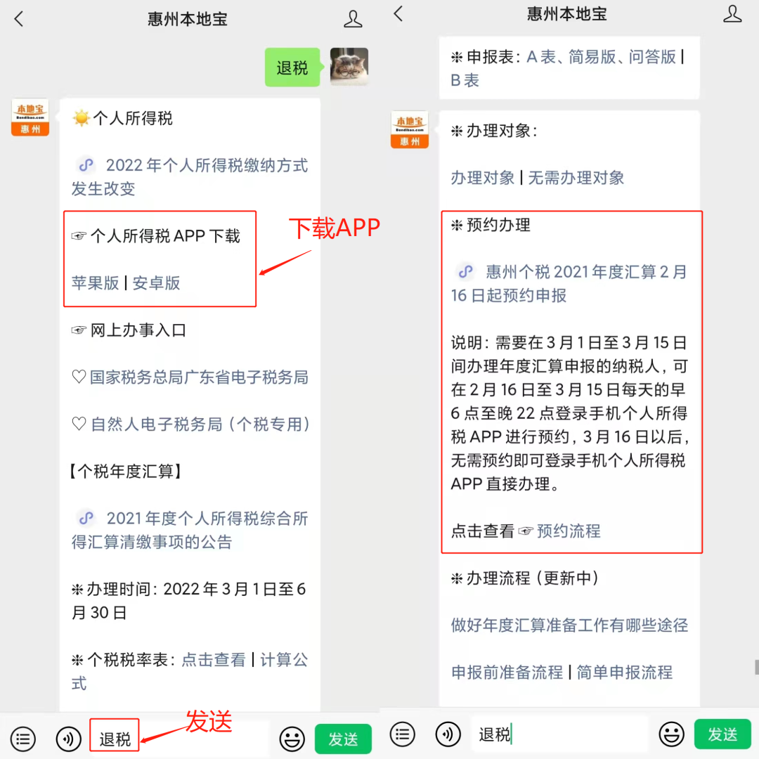 大家可以在手机应用市场上下载,也可以点击下方名片,关注惠州本地宝,在微信对话框发送【退税】获取下载入口,下载后进入APP进行注册并登录。