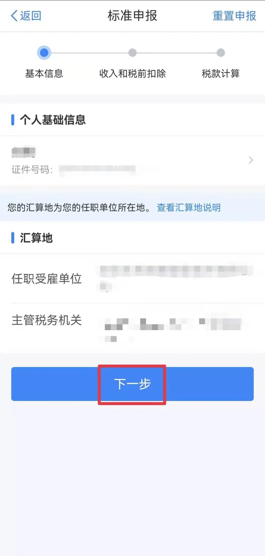之后根据系统提示,对个人基础信息、汇缴地进行确认,点击【下一步】