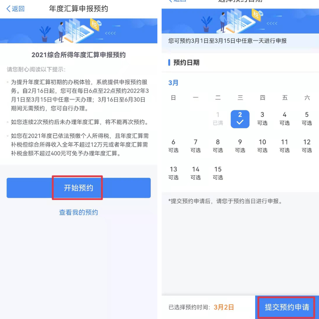 纳税人如需在3月1日至3月15日之间办理年度汇算,可在2月16日至3月15日每天的早6点至晚22点登录手机个人所得税APP进行预约,预约成功后在预约日期进行办理即可。