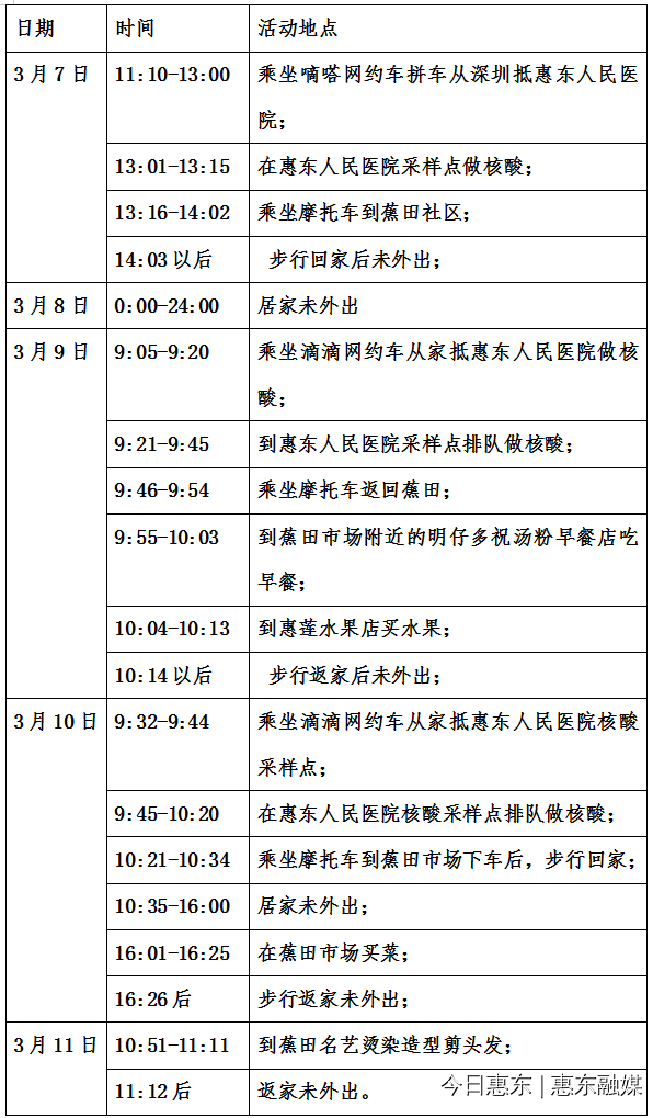 3月11日晚,惠东县接到深圳市福田区疾控中心通报我县1名人员与初筛阳性人员有同时空交集情况,被判定为参照密切接触者。该名人员于3月7-11日在我县内有活动轨迹,3月7日、9日、10日3次核酸检测结果均为阴性。目前已对该名参照密切接触者采取了集中隔离医学观察,并对其居住、活动场所进行预防性消毒。现将该名密切接触者的活动轨迹公告如下: