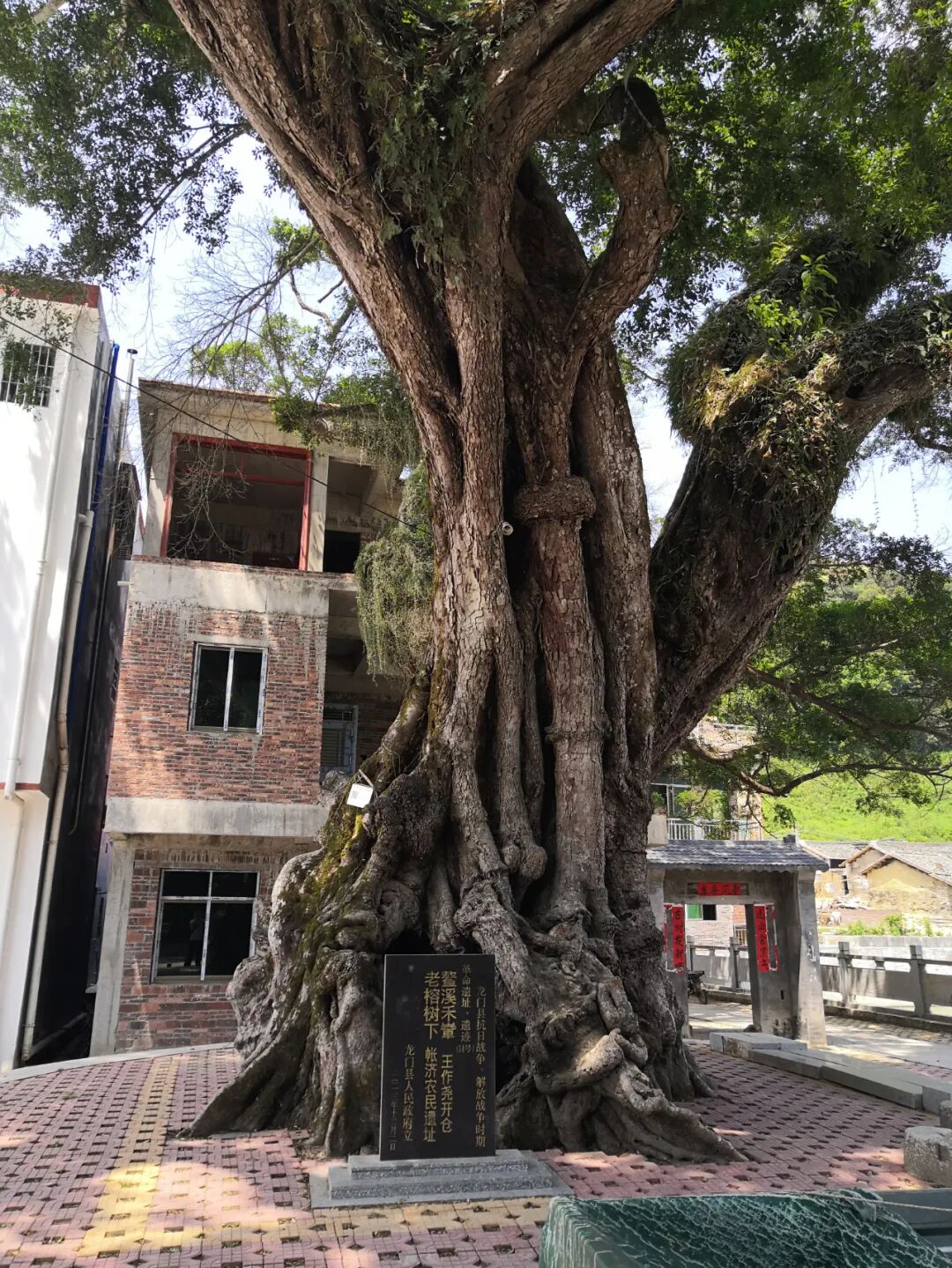 相传300年前,这棵大樟树,经历了雷击,躯干被烧成空心。后来,有一只小鸟飞过,口中衔着的一枚榕树种子正好掉进了被烧空的树干中。榕树种子在里面生根发芽,茁壮成长,两棵树便完全融为一体,形成“樟皮榕身”的奇观。当地村民认为那播种的小鸟是天上的神灵,视这棵古树为守护村庄的神树。