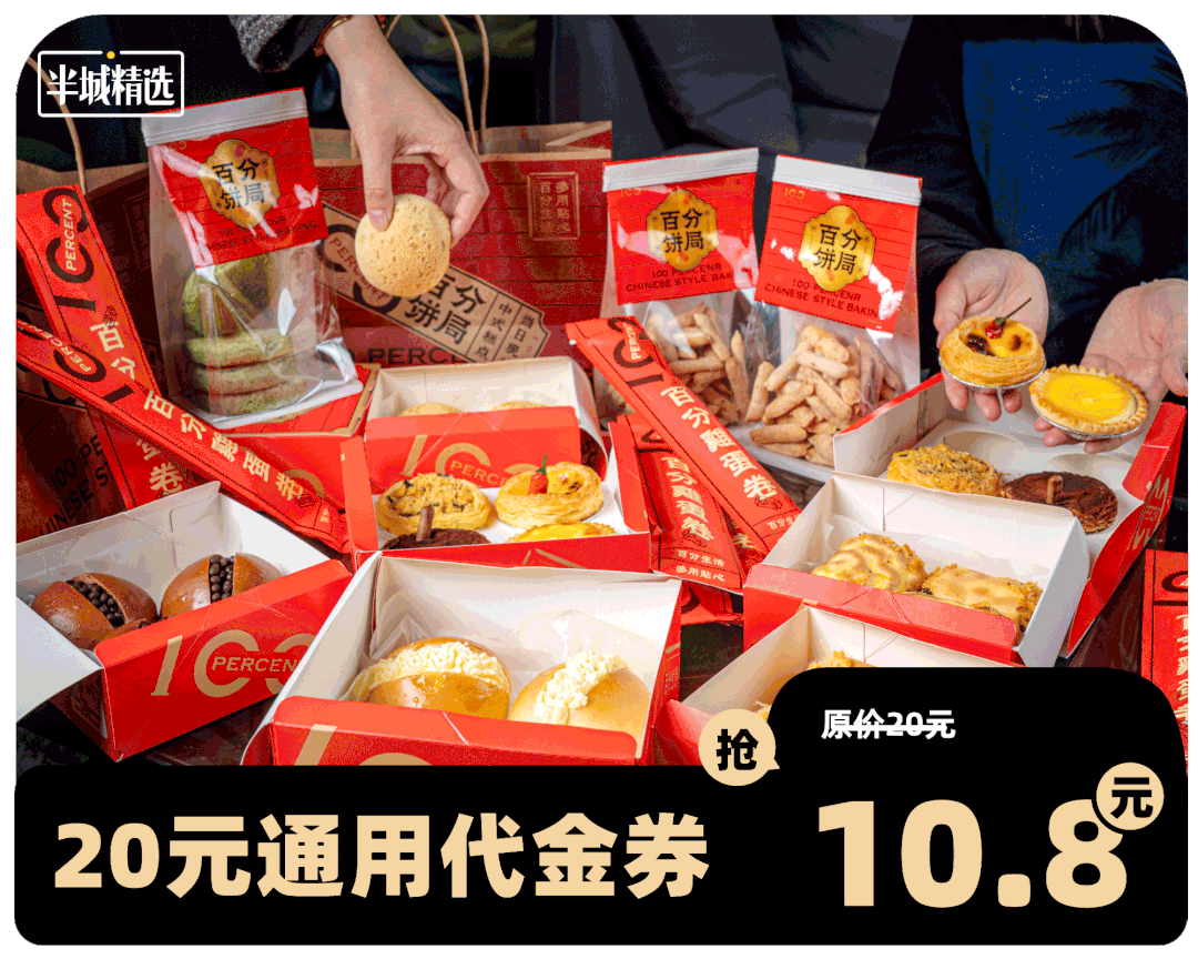 10.8元抢购全场任选20元代金券!百分拉丝卷、斑斓麻薯、巧克力脆脆包、小米椒蛋挞…随心选!12.9元抢糕点小礼盒,含:百分拉丝卷+巧克力脆脆包+辣椒蛋挞+斑斓麻薯!