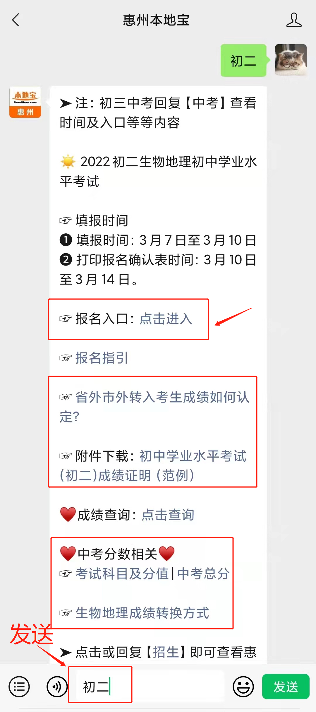 ?小编提示:点击下方公众号名片关注“惠州本地宝”,在微信对话框回复【初二】,即可获取2022年惠州初二生物地理考试网上报名入口、报名指南、成绩证明(范例)、中考分数说明、后续的成绩查询入口等等。