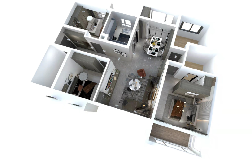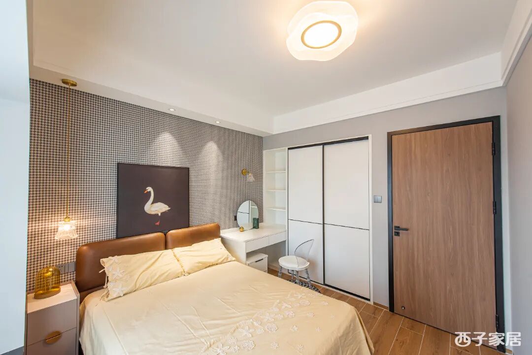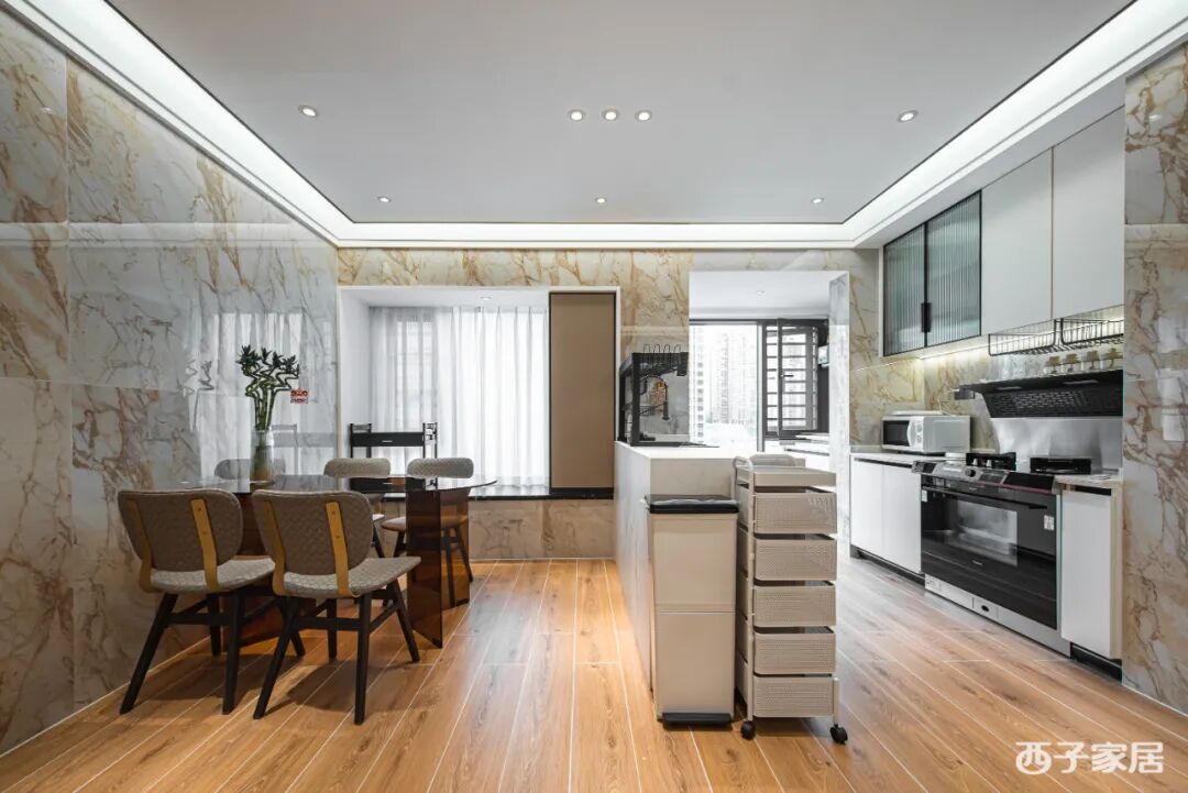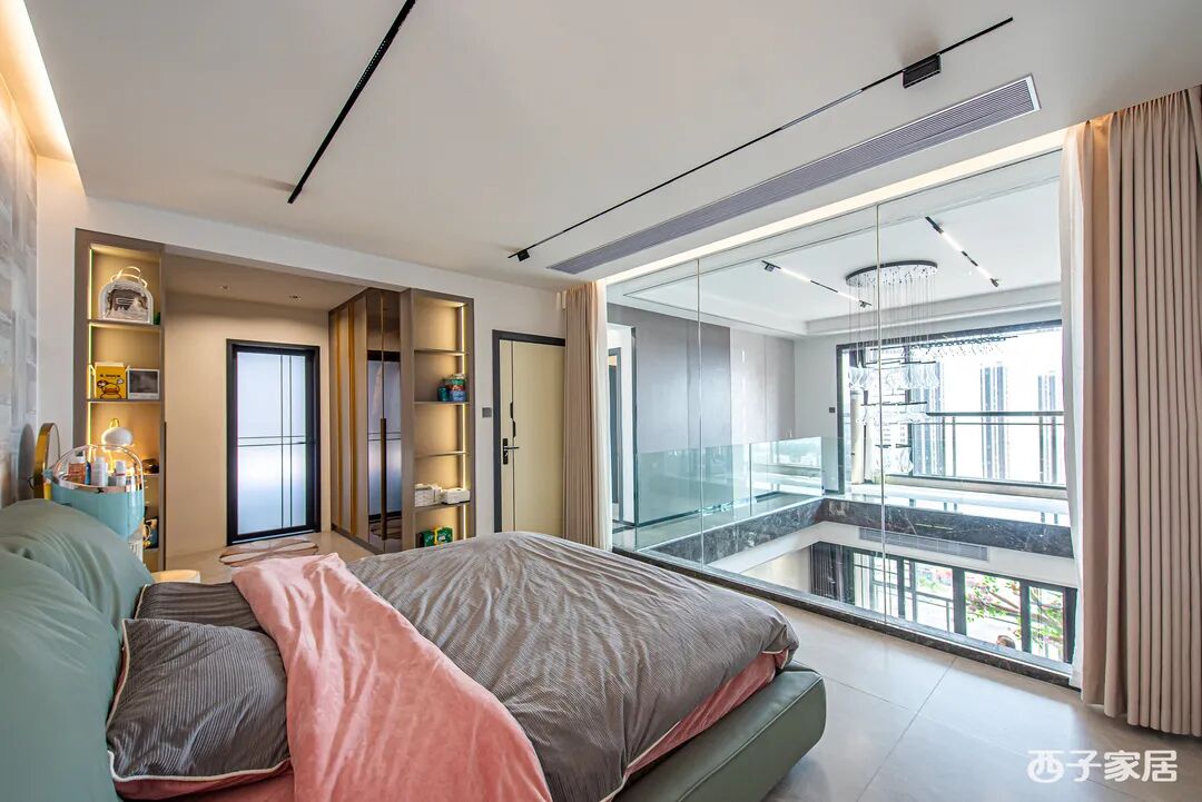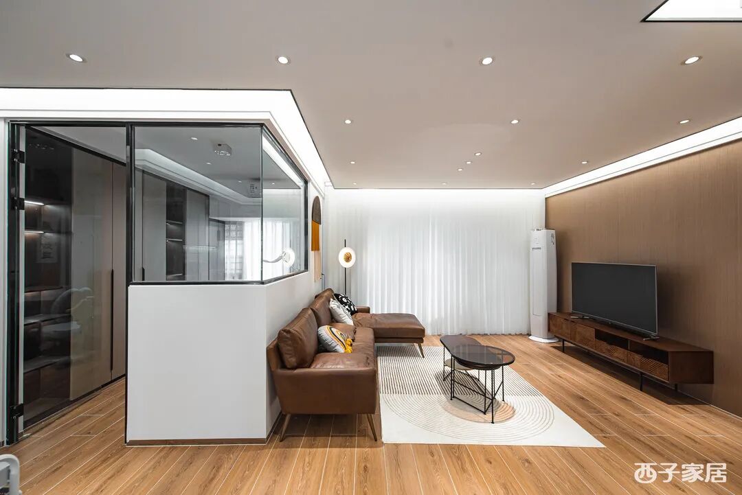 三代同堂的家应该是什么样的?它没有标准答案,但在业主心中却有最优选择。在业主与栋梁品质的积极交流下,这样一个现代又复古的空间诞生了。巧克力色的中古风沙发、抱枕以及墙上的挂饰等小物件都是屋主自己在网上淘的;依照屋主的生活方式,厨房做了开放式的处理。用玻璃隔断来扩大书房的采光面积,减少空间的阻塞感;主卧原本有个卫生间,按照业主的实际需求,将其改造成了一个藏于衣柜门后的衣帽间;老人小孩房则遵循环保至上的原则,使用红棉花板材,在色彩上也做了适老化和迎合孩子喜好的调整。