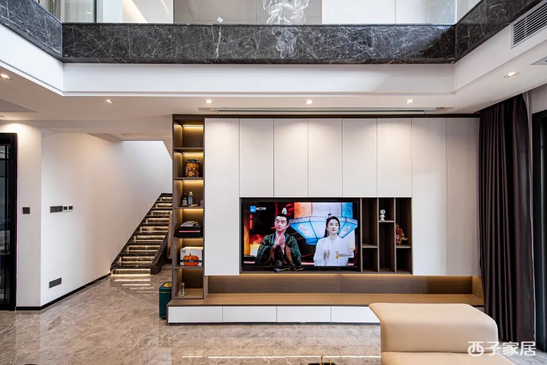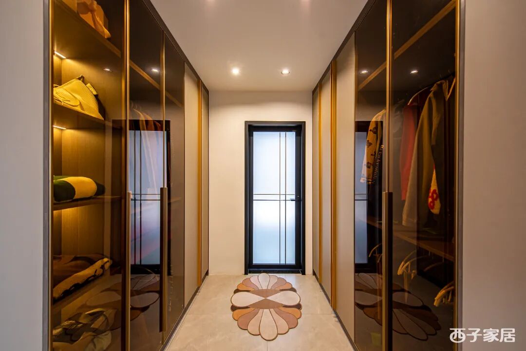 这套简约中带几分轻奢的现代复式案例,由栋梁品质完成全屋定制。从入户门到主卧,都依据业主的生活需求进行了独特的定制。靠近门口的多功能鞋柜和餐边柜,在黑色窄边玻璃门和灯带照明的点缀下大大提升了空间质感。客厅区域,电视背景是深原木色的柜体搭配肤感门板,满足业主的收纳需求;主卧衣帽间的玻璃柜门、金色极细边框和暗藏灯带的设计,现代感十足。