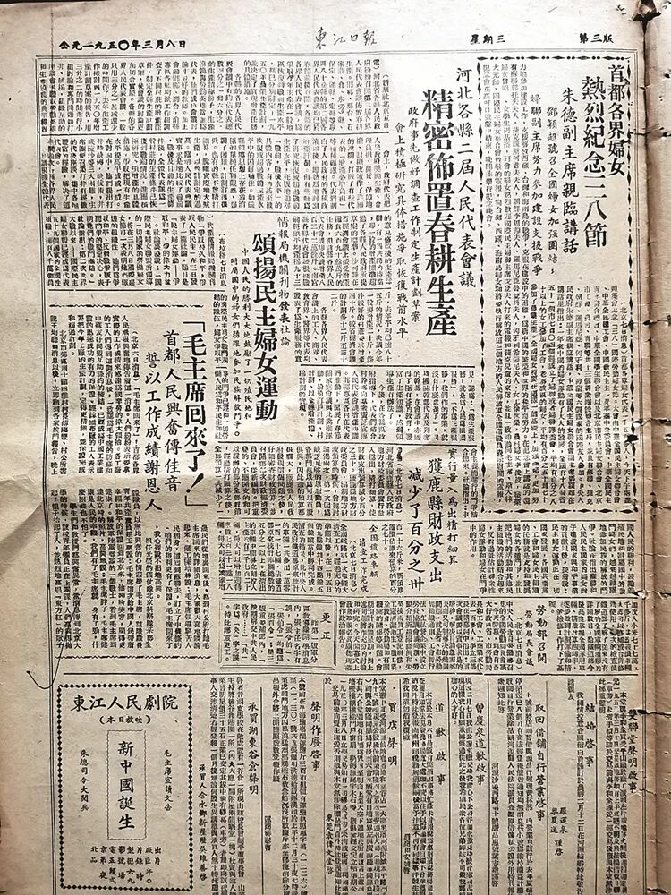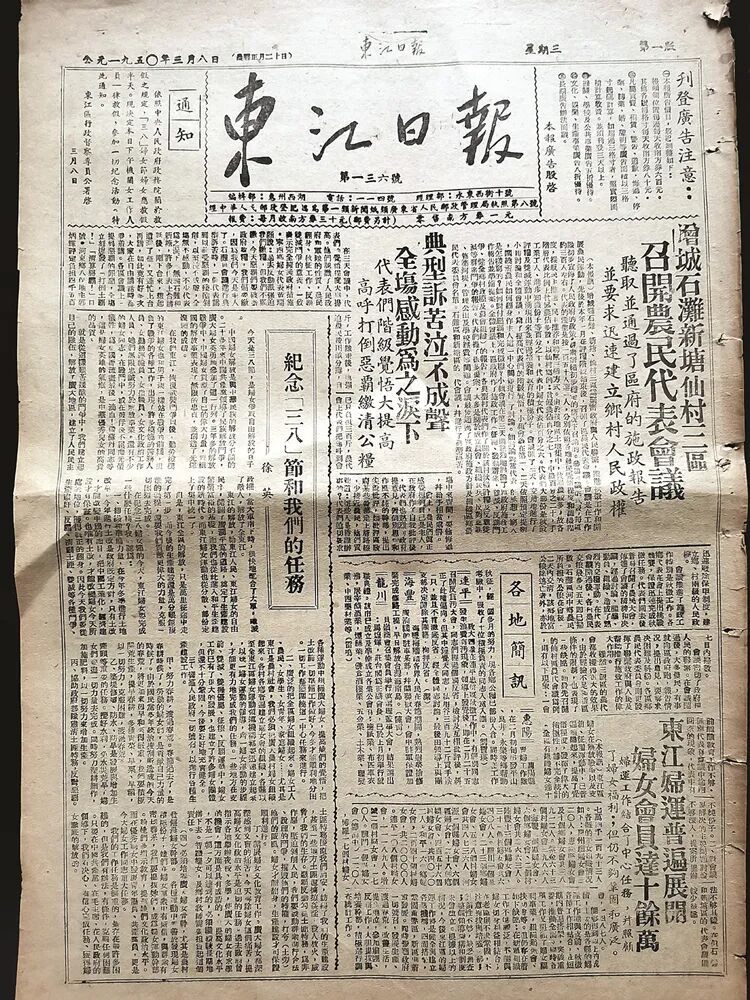 1950年3月8日出版的《东江日报》,报纸第三版刊发报道《首都各届妇女热烈纪念“三八”节》,报道了朱德副主席亲临讲话、邓颖超号召全国妇女加强团结。