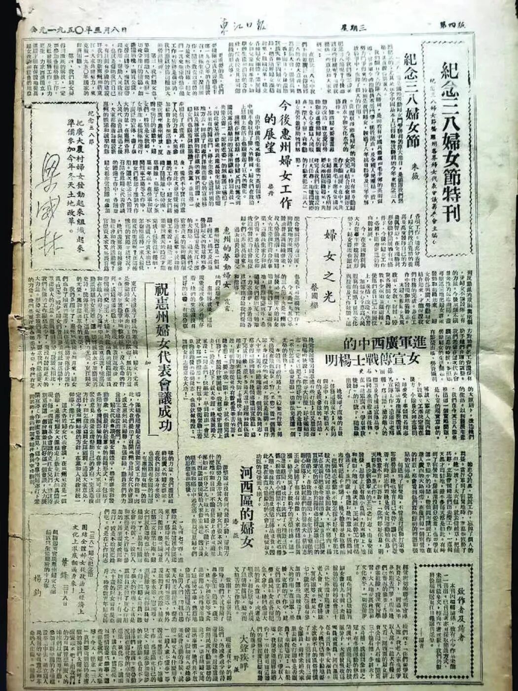 1950年3月8日出版的《东江日报》,报纸第四版为“纪念三八妇女节特刊”,由纪念三八妇女节暨惠州各界妇女代表会议筹委会主编,整版刊发惠州纪念妇女节文章,分别为《纪念三八妇女节》《今后惠州妇女工作的展望》《祝惠州首届妇女代表会议成功》《河西区的妇女》等文章。