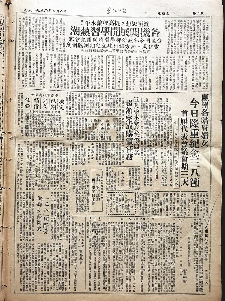 1950年3月8日出版的《东江日报》,报纸第二版刊发预告消息《惠州各阶层妇女,今日隆重纪念三八节,首届代表会议会期三天》,刊发惠州首届妇女代表大会开幕典礼及会议相关议程。在第二版中,为了普及群众对“三八”妇女节的认知和了解,还专门刊登《“三八”国际劳动妇女节简史》。