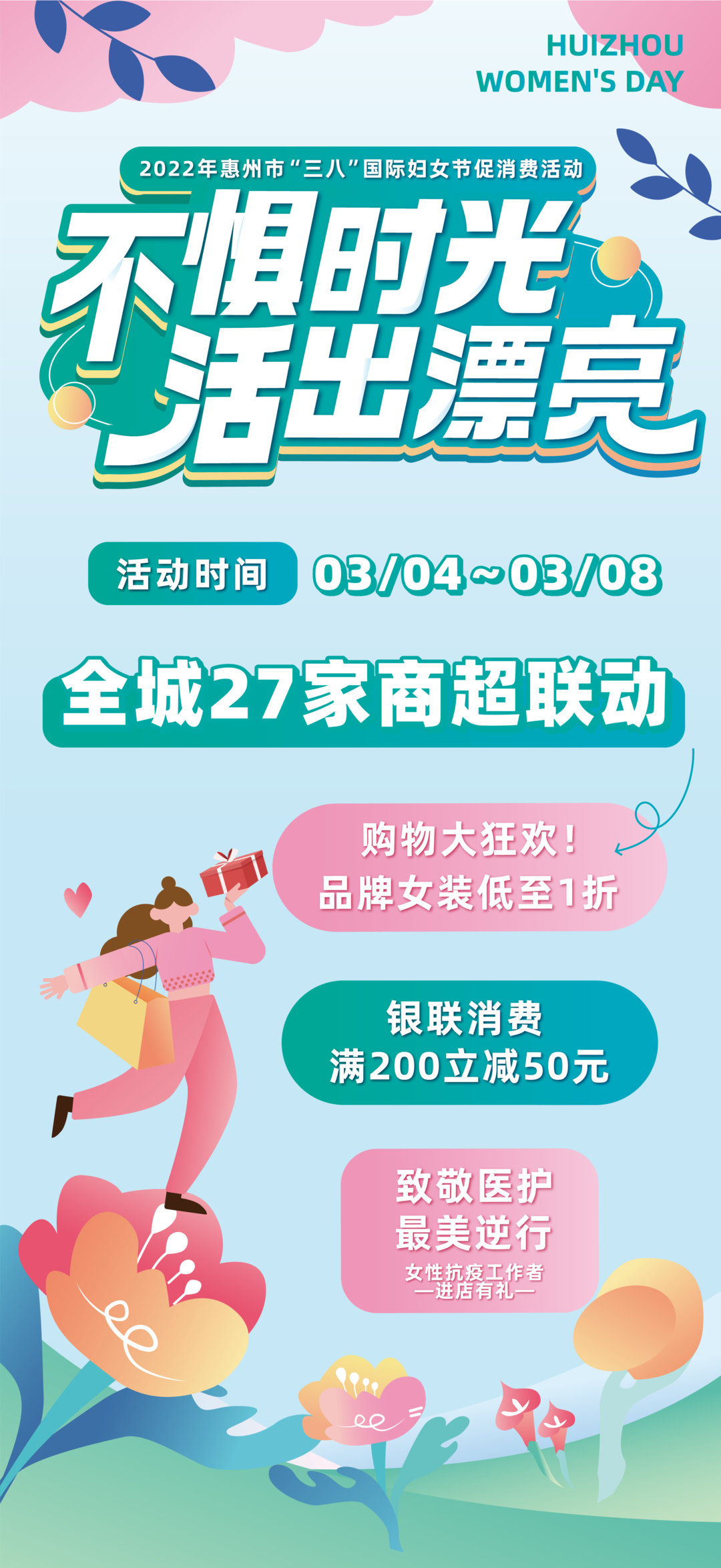 【2022年惠州市“三八”国际妇女节促消费活动】是由惠州市零售商业行业协会在惠州市商务局及惠州市妇女联合会的指导下,组织全市各大商场、超市开展线上、线下相结合,以“不惧时光,活出漂亮”为主题,制定了一系列女性专属福利促销活动。