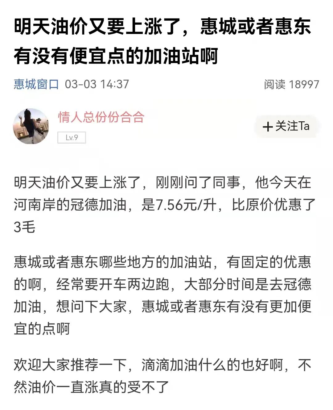 西友@情人总份份合合 在西子湖畔App发帖,表示油价又要上涨,大部分时间是去冠德加油,想问下大家,惠城或者惠东有没有更加便宜的点?