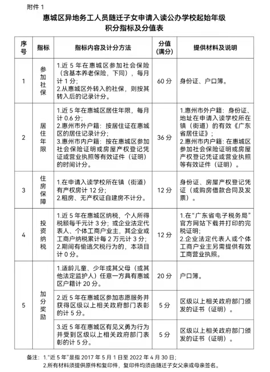 惠州市教育局《关于建立义务教育阶段随迁子女积分入学制度的通知》(惠市教基〔2015〕11号)及义务教育阶段学校招生工作有关文件精神,2022年我区异地务工人员随迁子女入读义务教育阶段公办学校起始年级继续实施积分入学的招生政策。