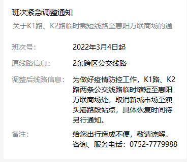 K1路、K2路两条公交线路临时缩短至惠阳万联商场处