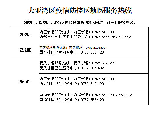 为保障大亚湾区辖区居民看病就医需求,大亚湾区在“三区”(封控区、管控区、防范区)内建立应急医疗服务保障体系,优化救治转诊流程,满足居民基本医疗需求。具体就医指引如下: