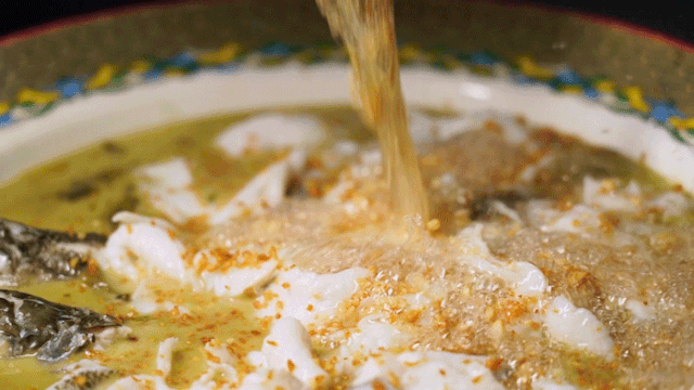 做酸菜鱼,陆小凤是专业的。鲈鱼切片、酸菜切段,放入蒜末、葱花、干辣椒…最后浇一泼热油,撒上白芝麻,再放上一颗花椒点缀,一盆色香味俱全的老坛酸菜鲈鱼就做好了。