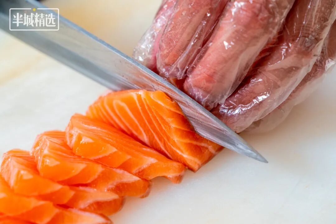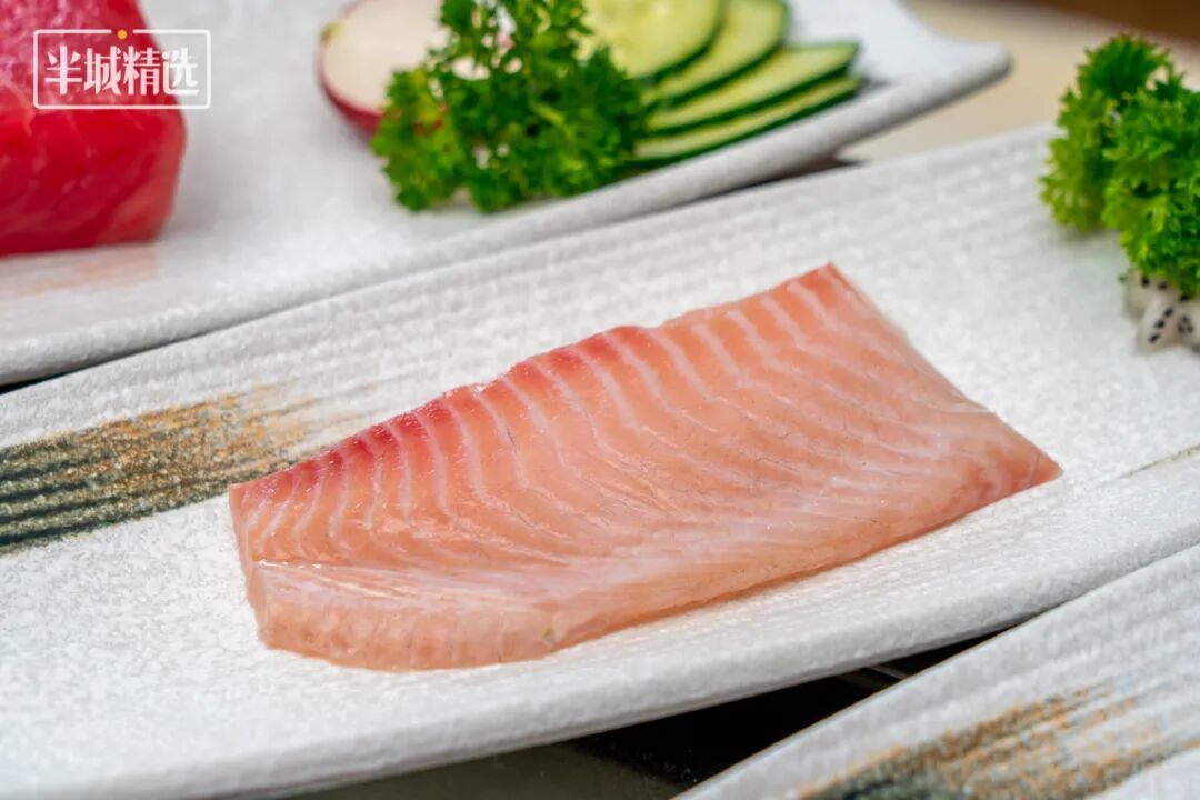 刺身爱好者可以放开肚皮吃了,三文鱼脂肪纹理明显,纹路很深,肉质肥美,搭上芥末酱油,滑溜一片就能塞满整张嘴。