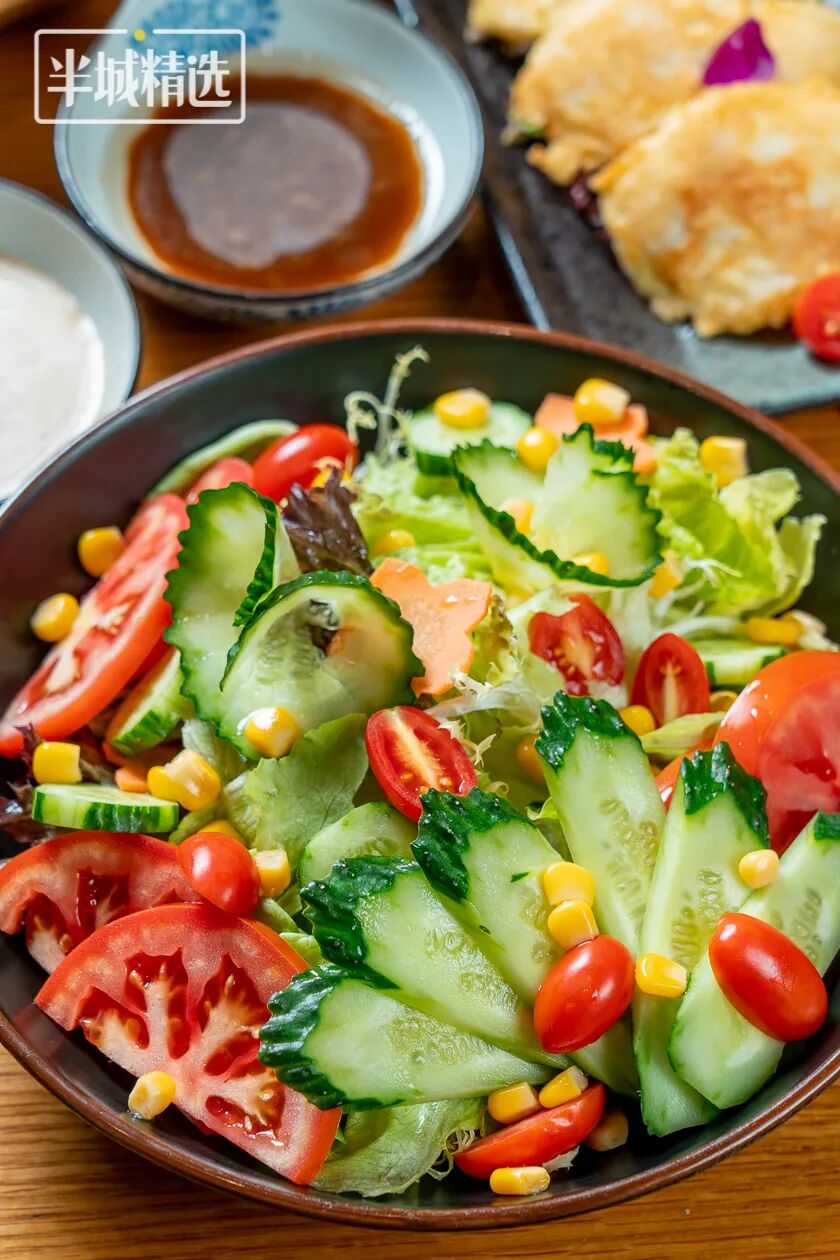 特制的沙拉酱与鱼子酱在蔬菜里拌开,番茄、黄瓜、胡萝卜等都有了别样清新的口感。