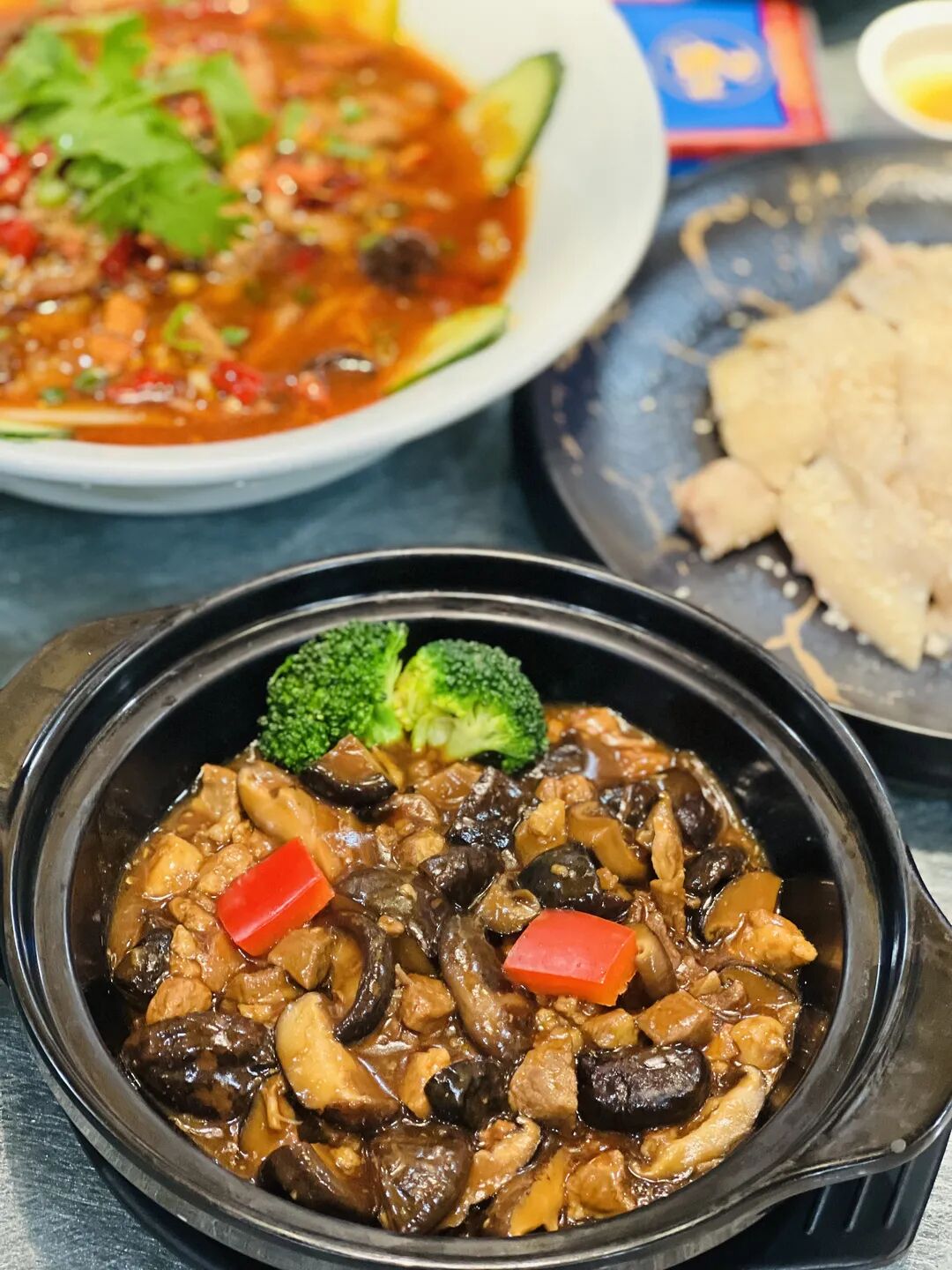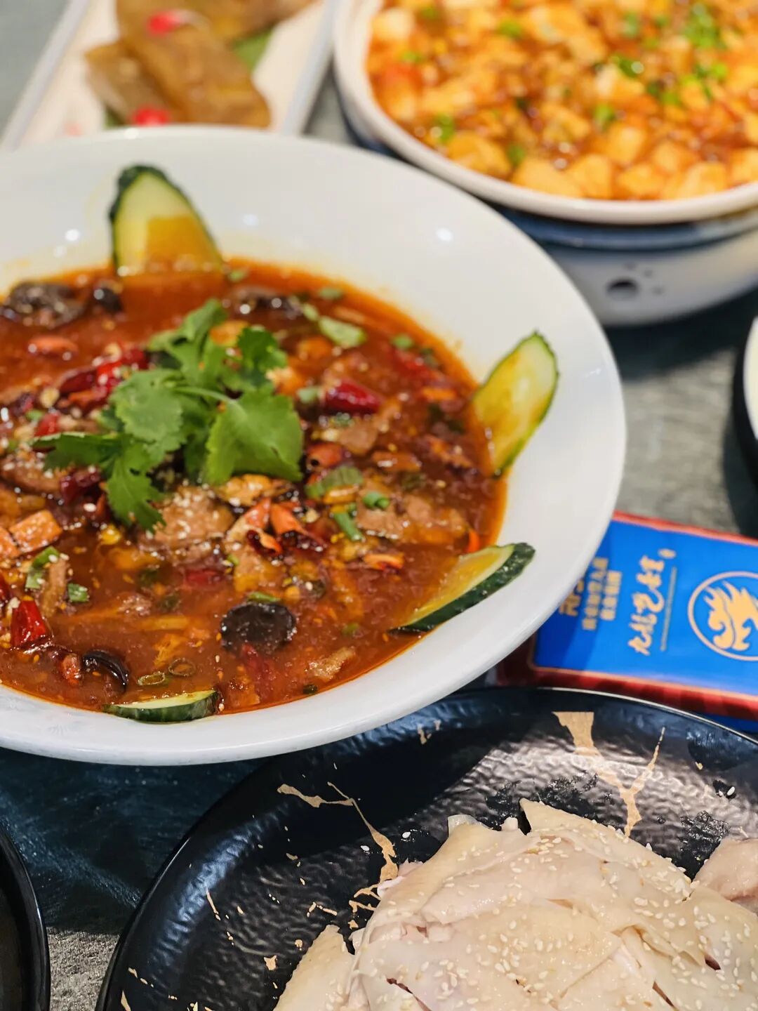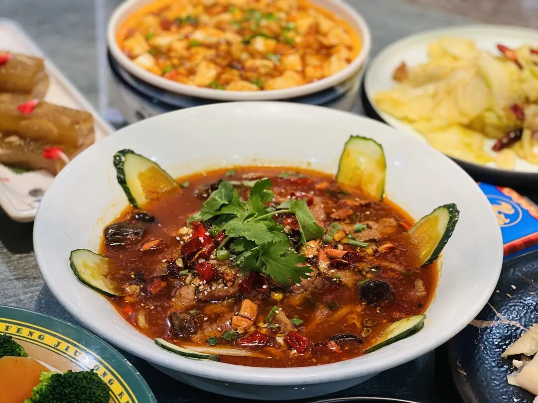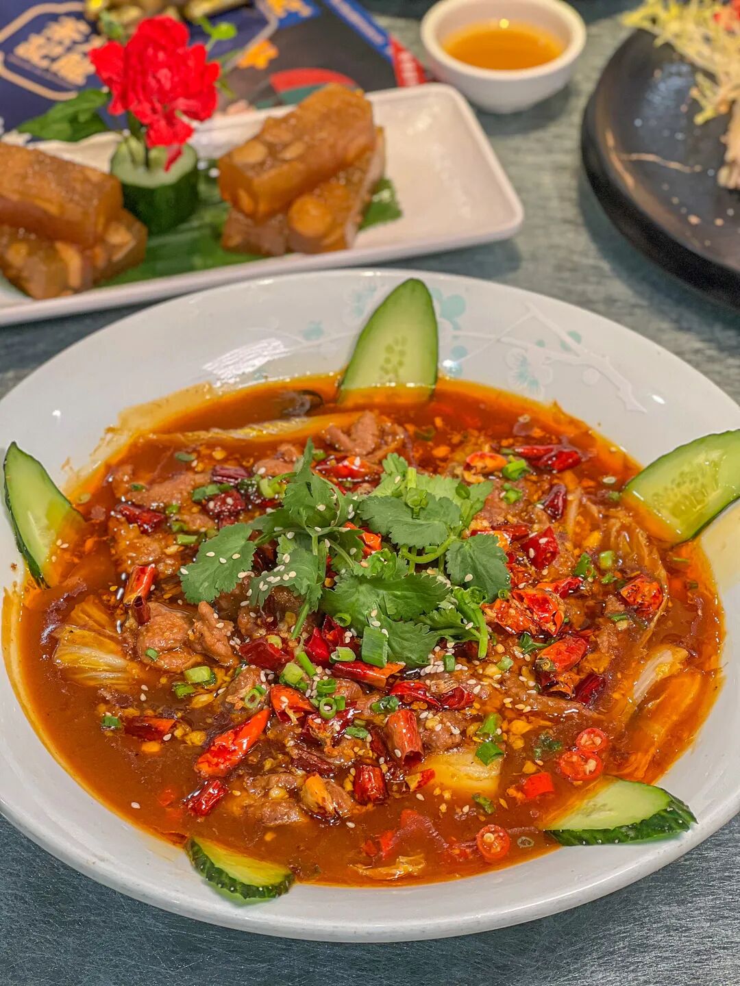 端上桌时红亮的汤汁,瞬间勾起胃里的馋虫。先别急着吃,还有赋予这盆牛肉灵魂的重要一步-浇油。220度的菜籽油,全方位浇灌,嗞啦~嗞啦~此时没有比这更动人的声音了吧。