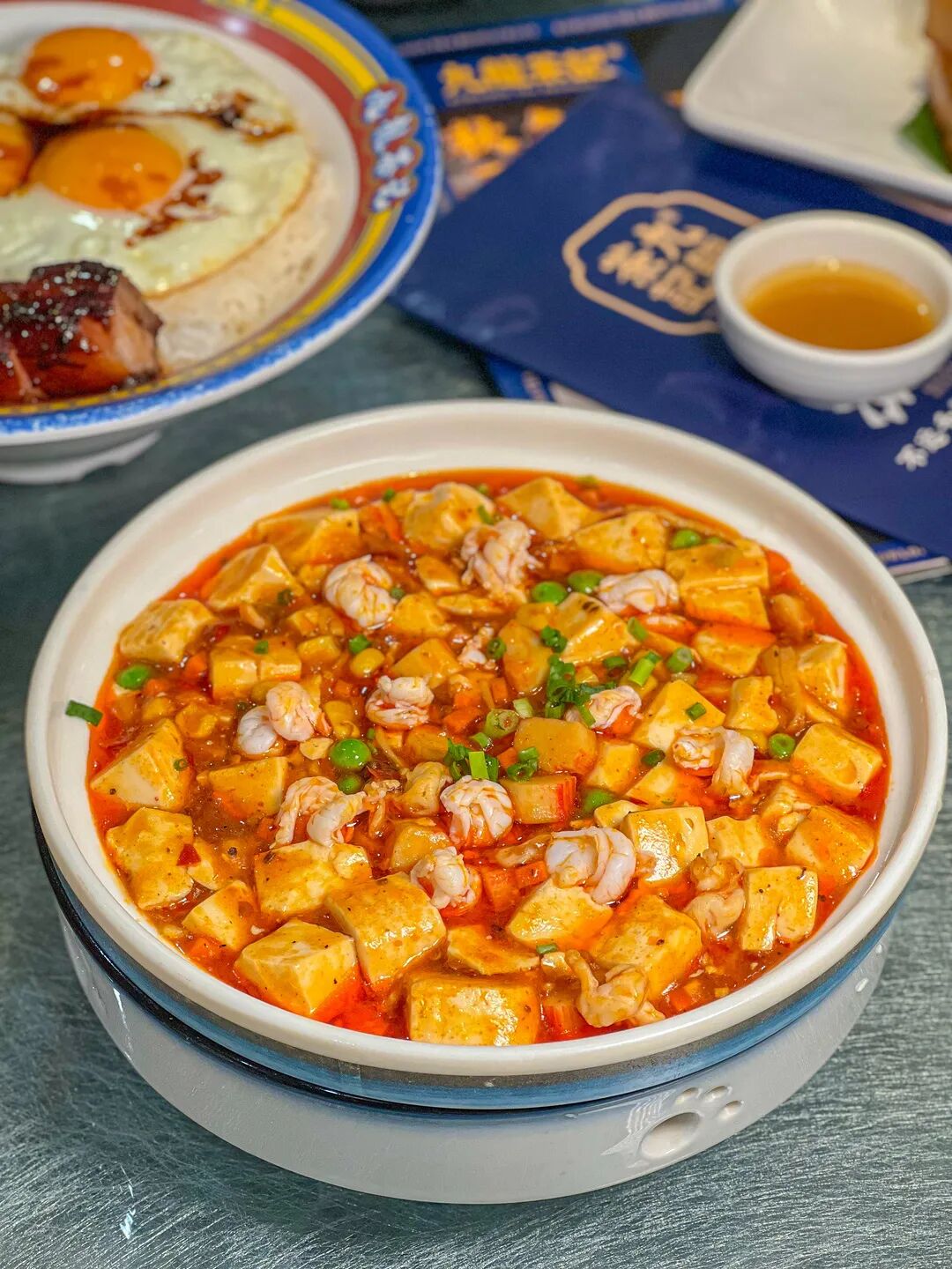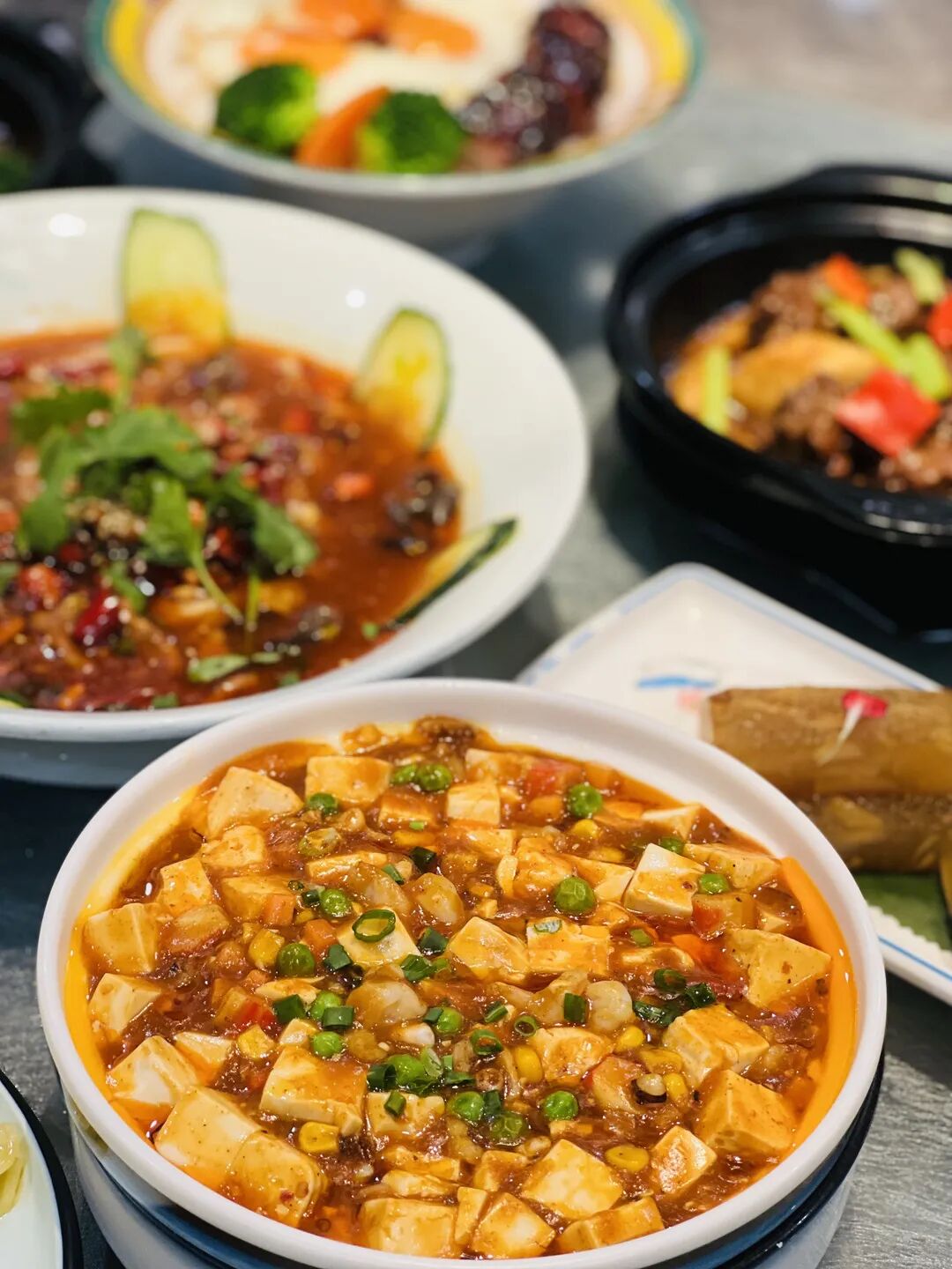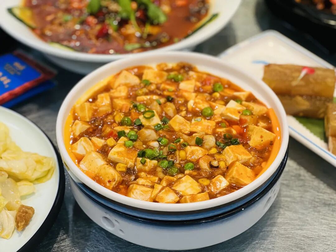 豆腐变成一个个小方块,搭配多种香料汤汁于一体,自成小乾坤。上面点缀些许葱花,一口一勺,香气在嘴巴中绽放,吸满了汤汁,口感丰富。