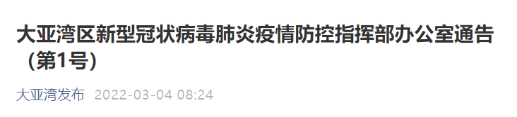 (一)自3月4日起,对大亚湾西区美岸栖庭东湖阁A栋、B栋进行临时封控管理,实行“区域封闭、足不出户、服务上门”。对大亚湾西区美岸栖庭其他区域进行临时管控管理,实行“足不出区,错峰取物”。对全区进行临时防范区管理,实行“强化社会面管控、严格限制人员聚集”。对全区的所有道路实施交通管制,管制期间人员原则上只进不出,非必要不离开,如因就医、特定公务等确需出入的,须持24小时内核酸检测阴性证明。因配合疫情管控而无法如期返岗返学的群众,由所在街道开具相关证明。