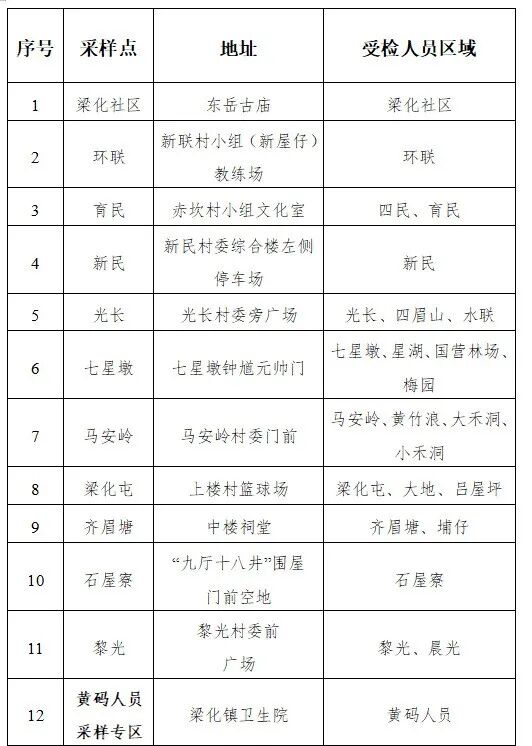 为进一步防范疫情输入风险,及早防范和切断病毒传播途径,切实保障人民群众生命安全和身体健康,经梁化镇防控新冠肺炎疫情工作领导小组研究决定,梁化镇定于2022年3月4日开展大规模核酸检测工作(免费),共设12个核酸采样点(其中一个为黄码人员采样专区),请广大市民群众就近步行前往参加核酸检测,现将有关事项通告如下: