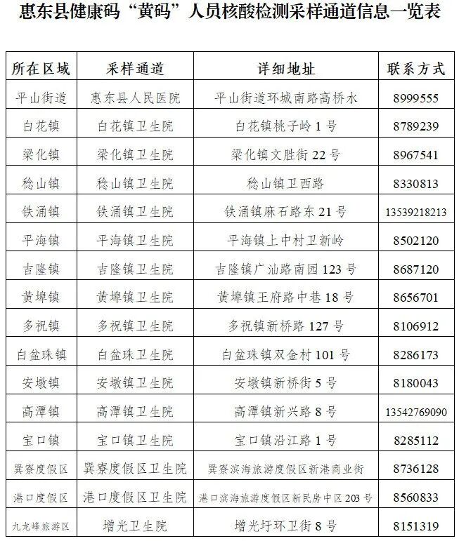 三、平山街道“黄码”专门通道设置在惠东县人民医院,其他镇(度假区、旅游区)“黄码”专门通道设置在各镇(度假区、旅游区)卫生院,具体点位详见下图。