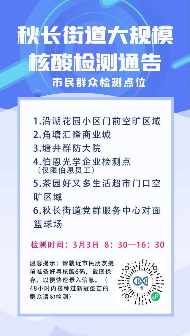秋长街道定于3月3日8:30—16:30开展大规模核酸检测,共设6个核酸采样点,居民可尽快就近到以下地点参加采样。