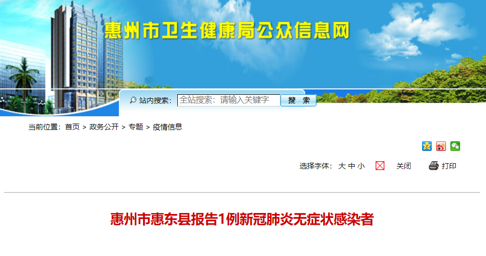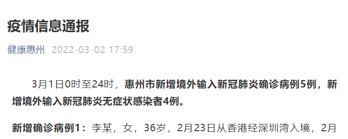 3月2日,惠州市惠东县报告1例新冠肺炎无症状感染者。