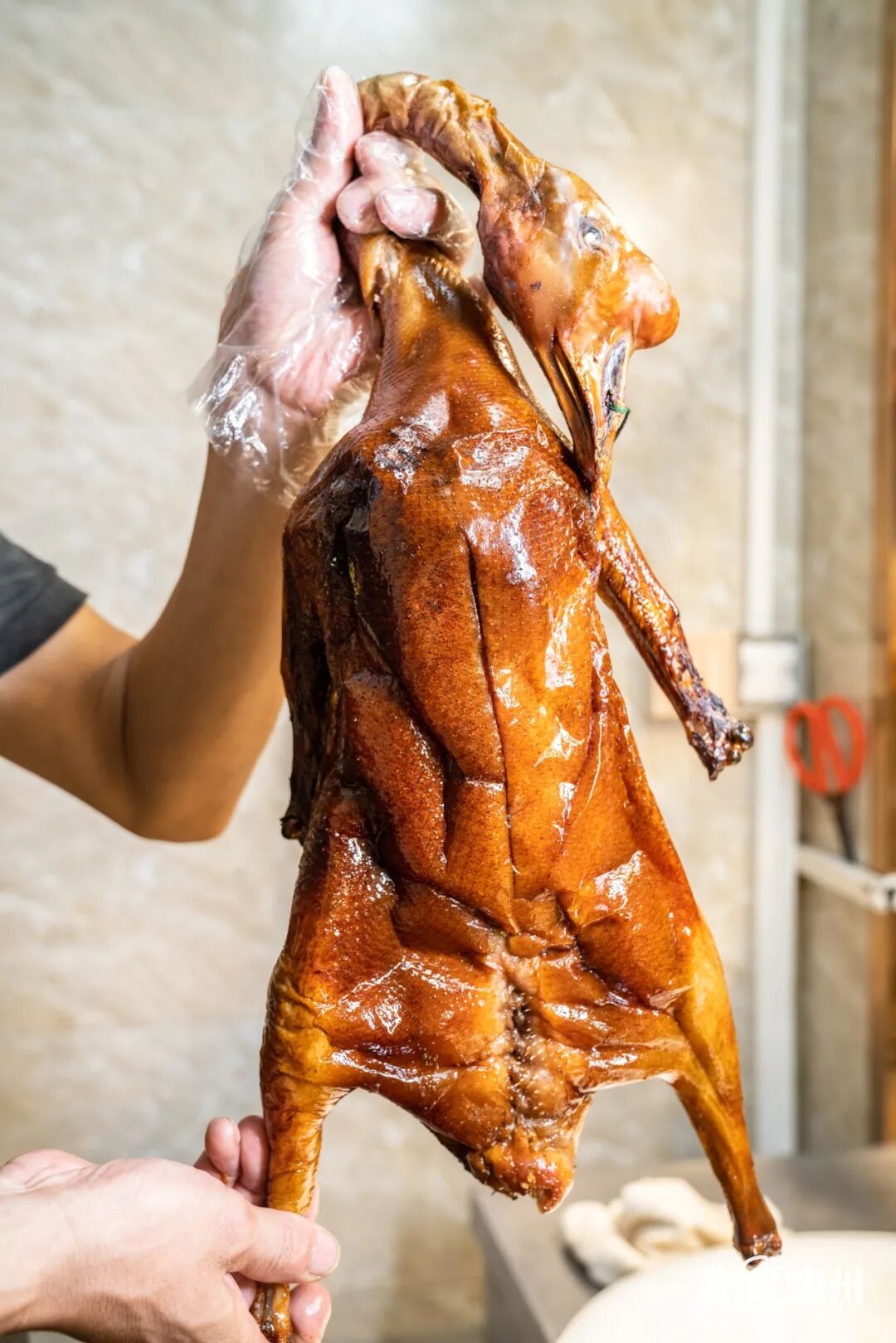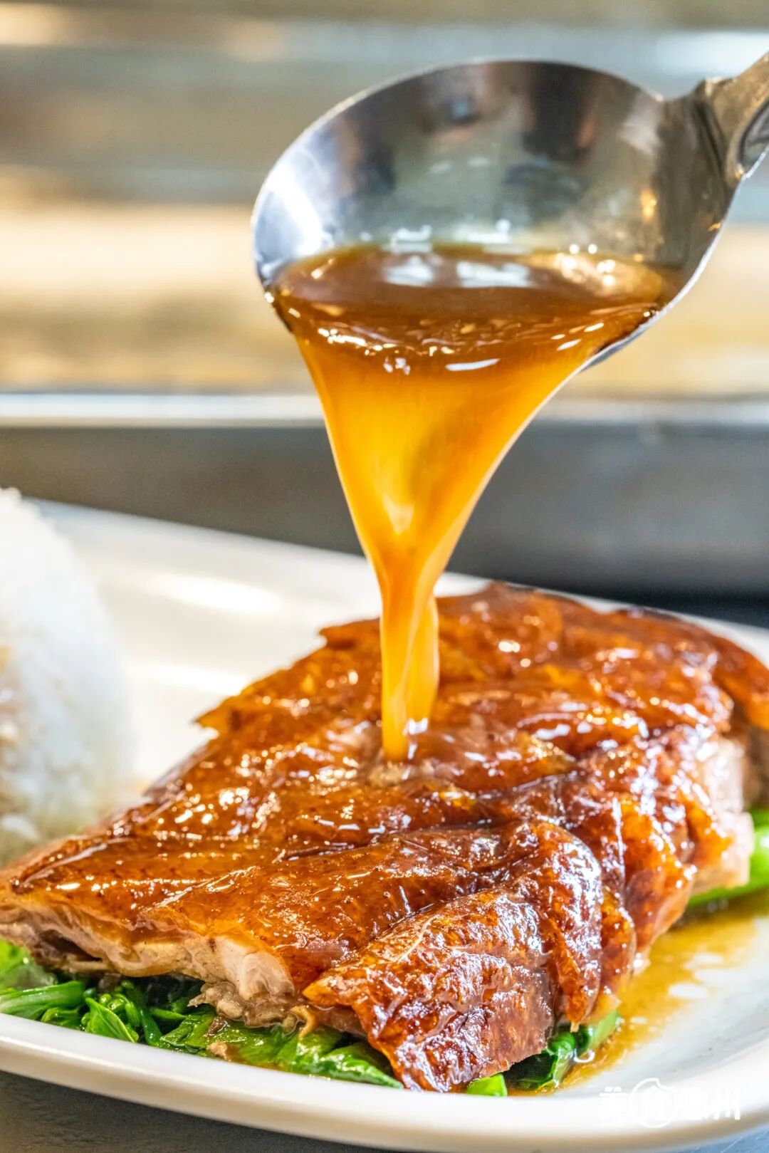 油光水亮的烧鹅整齐地挂在橱窗上,让人进门就一眼看到,颜色红亮的烧鹅皮薄而脆,师傅落刀干净利落,淋上灵魂卤汁,令人食指大动。