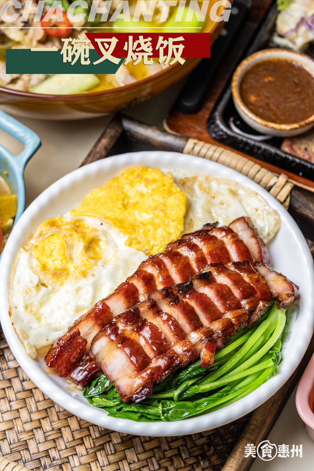叉烧饭更是必点的菜品之一。一大碗的米饭上铺上煎好的两个荷包蛋,肥瘦相间的叉烧泛着油亮的光泽,微甜的口感让叉烧并不会腻。