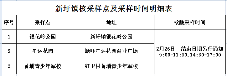鉴于当前深圳、东莞疫情形势复杂,结合新圩镇实际情况,原定于2月25日结束的核酸采样点,现因疫情防控工作需要,继续保留,核酸采样时间有所调整。具体安排如下: